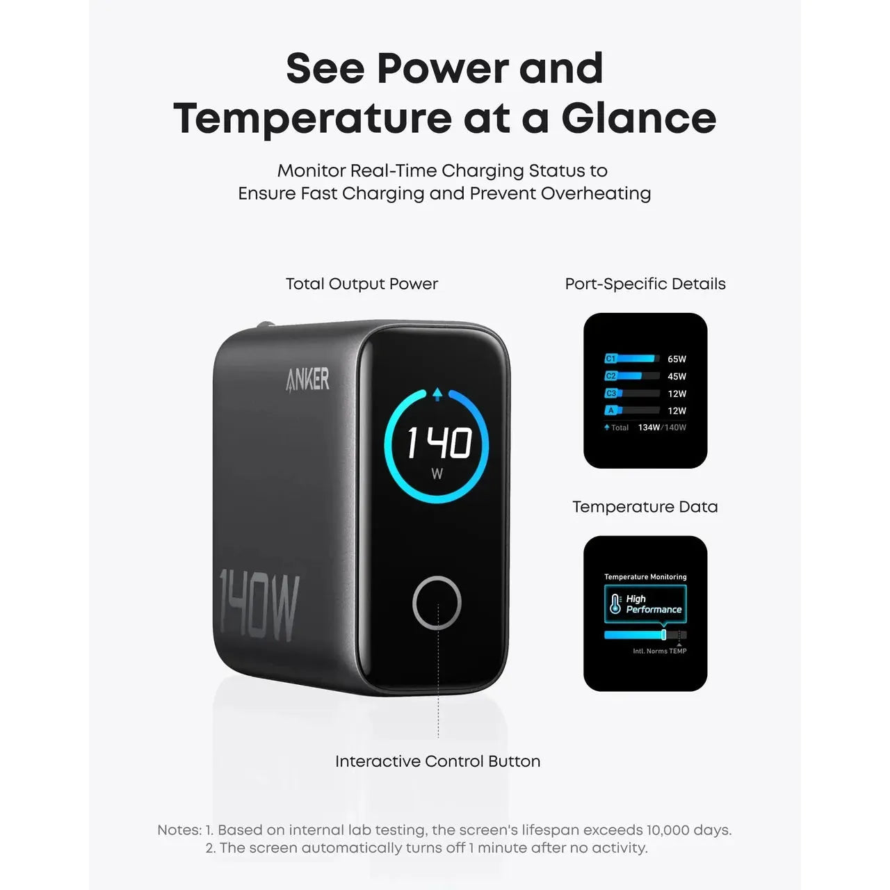 عند استخدام جميع المنافذ الأربعة في آن واحد، يدعم الشاحن طاقة قصوى مجمعة عالية تصل إلى 134 واط. وهذا يضمن شحن جميع الأجهزة بسرعة وكفاءة. كما أن دقة توزيع الطاقة وذكاءها يجعلان هذا الأمر ممكنًا. أنكر يُعد هذا الشاحن خيارًا متميزًا لشحن أجهزة متعددة.