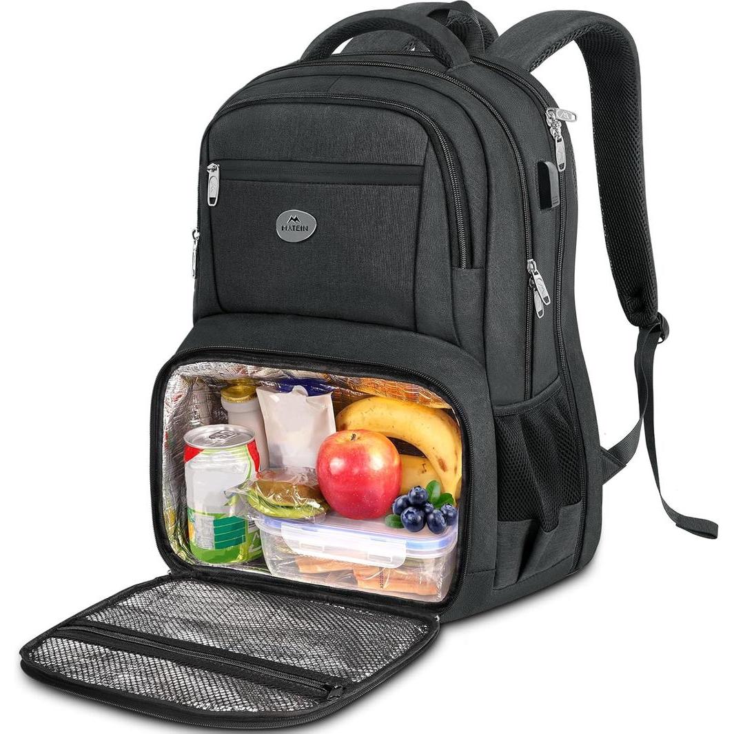The MATEIN 17 Inch Laptop Backpack combines professional design with practical functionality for modern travelers and commuters. This spacious TSA-compliant travel backpack accommodates laptops up to 17 inches, protecting your device during transit while meeting airport security standards. The integrated lunch box compartment keeps meals and beverages separate from your electronics and documents, maintaining organization throughout your day. Multiple dedicated pockets organize cables, chargers, and accessories, while the ergonomic shoulder straps and padded back panel distribute weight evenly for comfortable extended wear. Constructed with durable, water-resistant materials, this versatile backpack suits both professional environments and weekend getaways. Whether you're navigating airport terminals, commuting to the office, or exploring new destinations, this unisex design adapts to your lifestyle with reliable storage and thoughtful engineering.