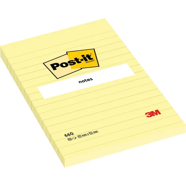 This pack of 3M Post-it® Notes provides 100 sheets of quality paper per pad, making it a cost-effective and efficient solution for all your note-taking needs. With 12 pads in a pack, you'll have plenty of notes to last you for multiple projects. The lined design ensures neat and organized writing, perfect for both personal and professional use. The standard 4 x 6 inch size (101 mm x 152 mm) is versatile and convenient for any task at hand.