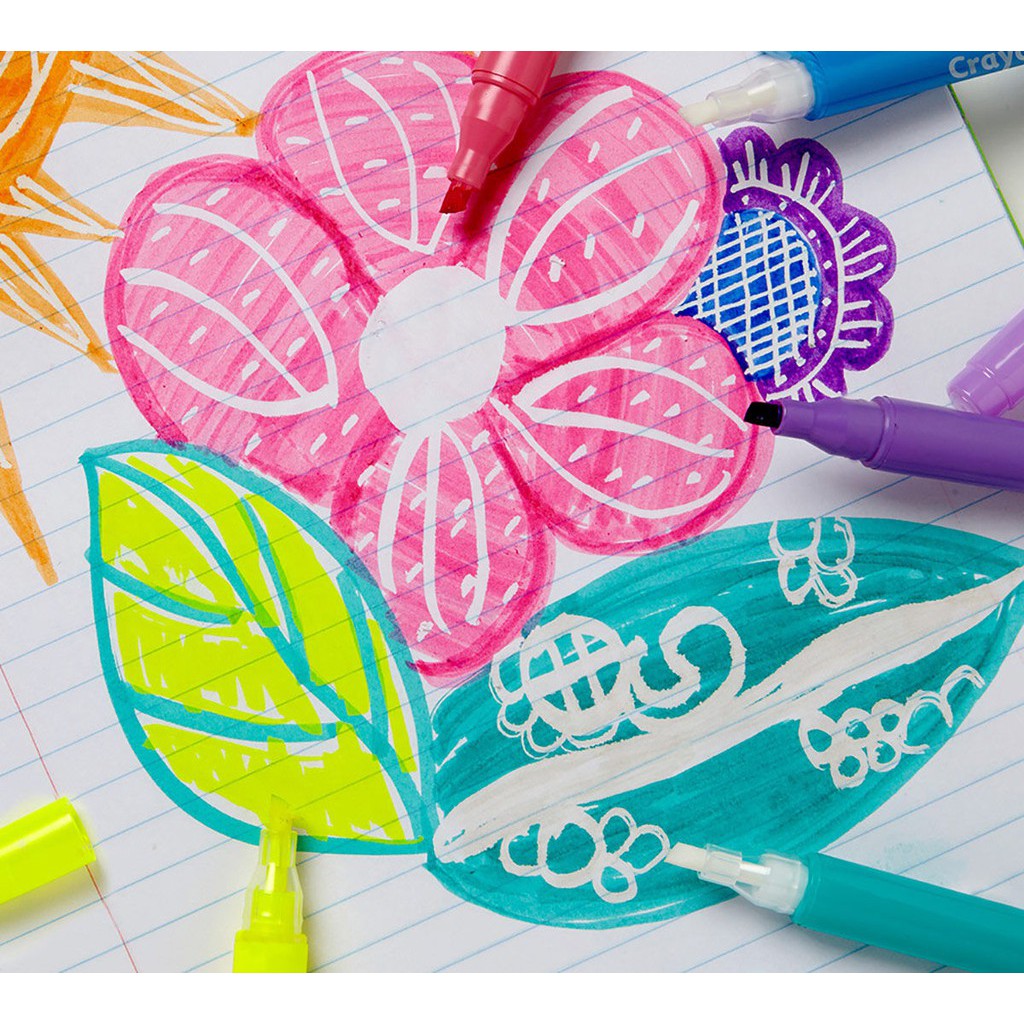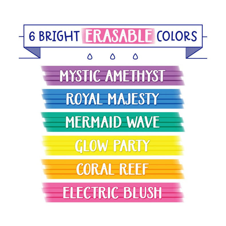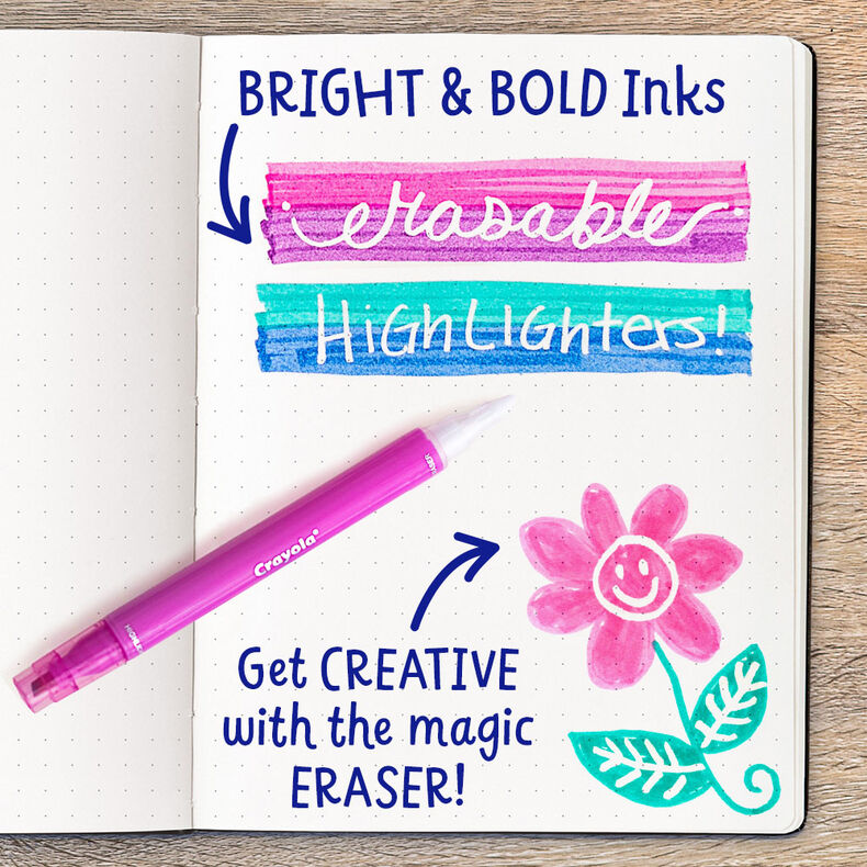 Highlight and erase in 6 vibrant colors without damaging books or documents! The Crayola Take Note Erasable Highlighters have bright colors on one end, with clear ink tips on the other end for magically erasing the colorful highlights. No more worrying about highlighting the wrong word or over-highlighting a page! Plus, the versatile chisel tips make it easy to create thick lines when highlighting and thin lines when underling. Includes 6 Dual-Tipped Erasable Highlighters in 6 different colors.