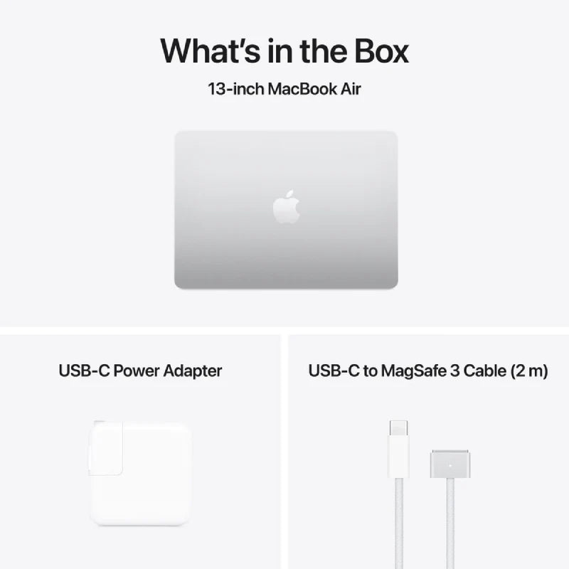 | In the Box | 13-inch MacBook Air, 30W USB-C Power Adapter (M4 with 8‑core GPU), USB-C to MagSafe 3 Cable (2m) |
