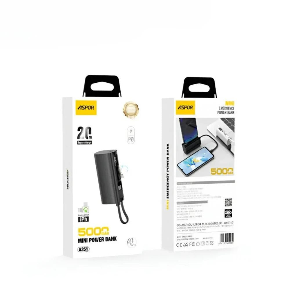 The Aspor A351 Mini Emergency Pocket Power Bank offers a reliable 5000mAh capacity, delivering up to 20W fast charging to keep your devices powered on the go. Equipped with both Type-C and Lightning ports, it ensures broad compatibility with a variety of smartphones and gadgets. Its compact black design fits easily into pockets or bags, making it an essential accessory for emergency power needs. Ideal for professionals and travelers, this power bank combines portability with efficient charging technology to provide dependable energy whenever and wherever you need it.
