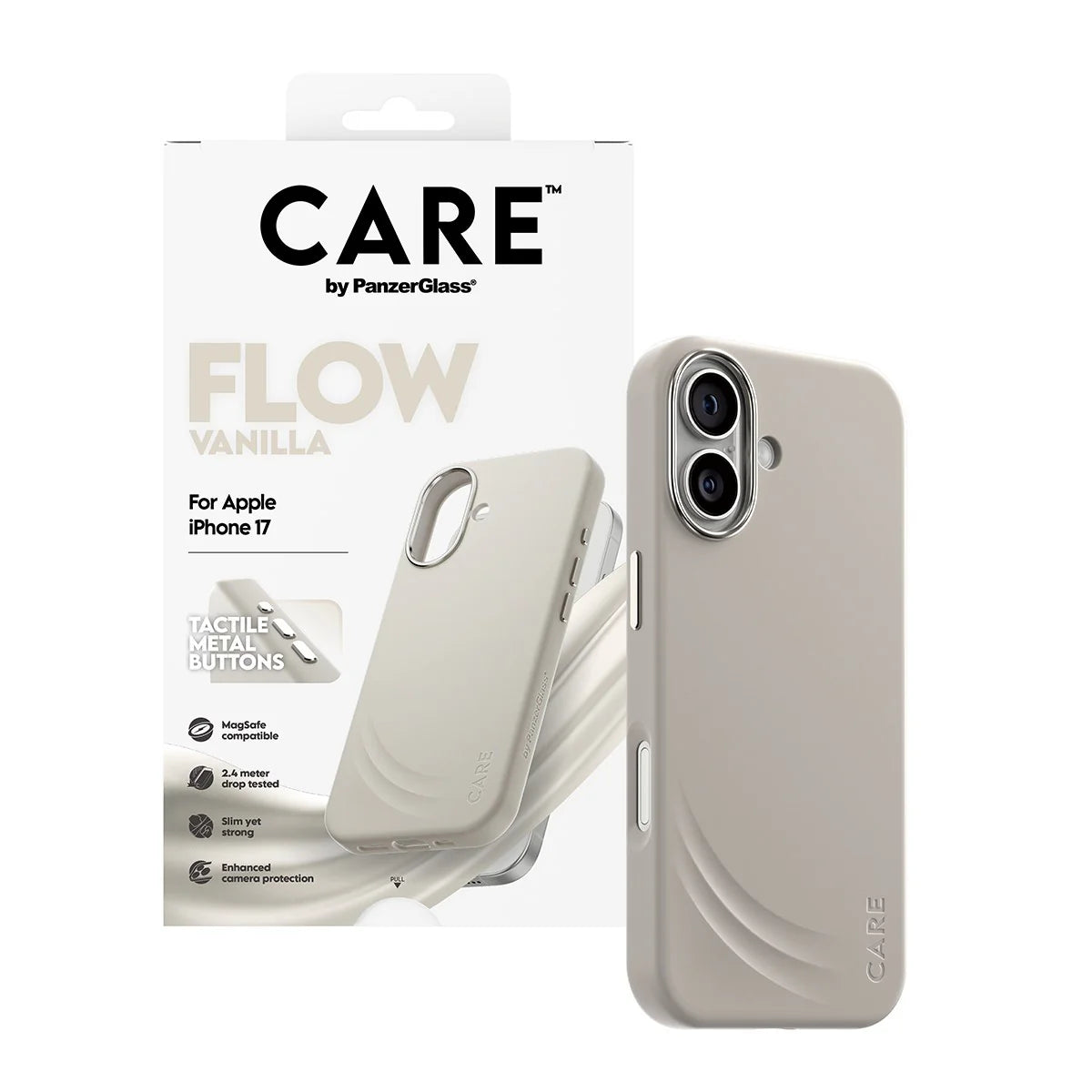Feel the flow! The CARE by PanzerGlass® Feature Flow Case with MagSafe is more than just a pretty face – it's your phone’s new best friend. The case is made with 60% recycled silicone and a soft-touch coating to wrap your device in everyday elegance and eco-love. Inside, a velvety microfiber lining gives your phone the care it deserves, while the raised bumper keeps your screen protected from fatal face-down falls.