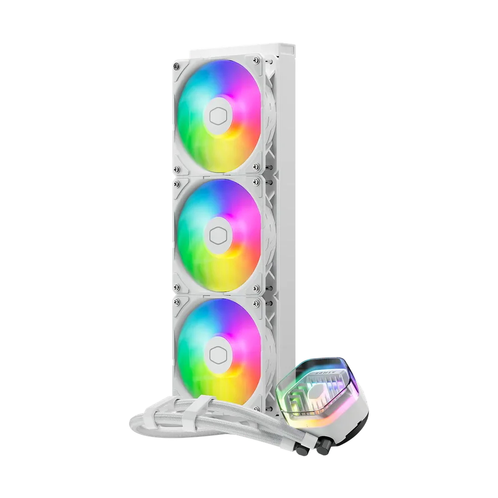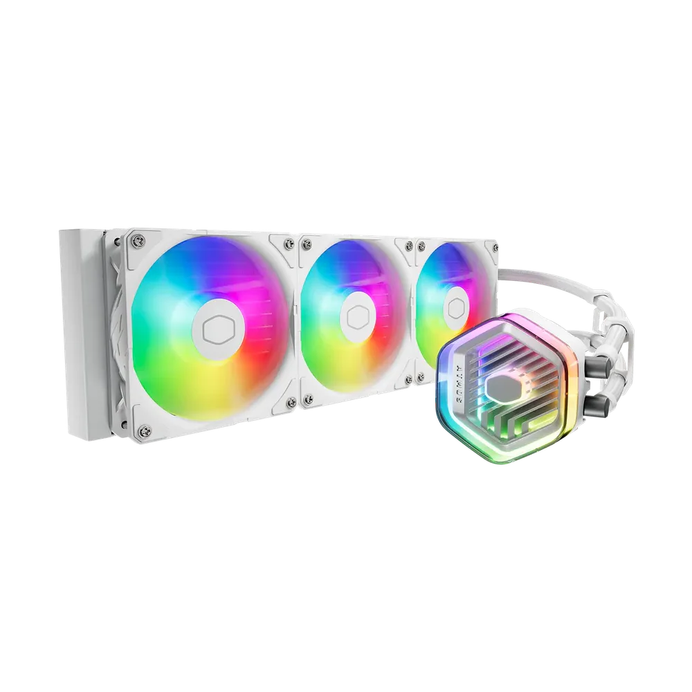 The next generation AIO liquid cooling is here with the MasterLiquid 360 Atmos White. The Atmos is our forward-thinking, innovative take on what an AIO cooler can and should be. Exceptionally silent performance provided by our SickleFlow Edge fans. An optimized user experience from unboxing to the Master CTRL software. A pump top cover fully customizable with your own 3D-printed creations. Eco-friendly construction implemented throughout. Our signature dual chamber pump design, refined. The Atmos represents the best of the best in modern AIO liquid cooling, a full 360 degrees of cool.