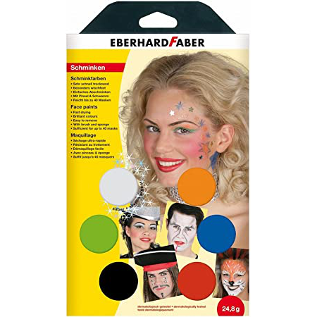 Colours: orange, red, blue, green, silver and black, the make-up colours can be mixed with each other, are dermatologically tested and very skin-friendly as well as manufactured according to the EU Cosmetics Directive