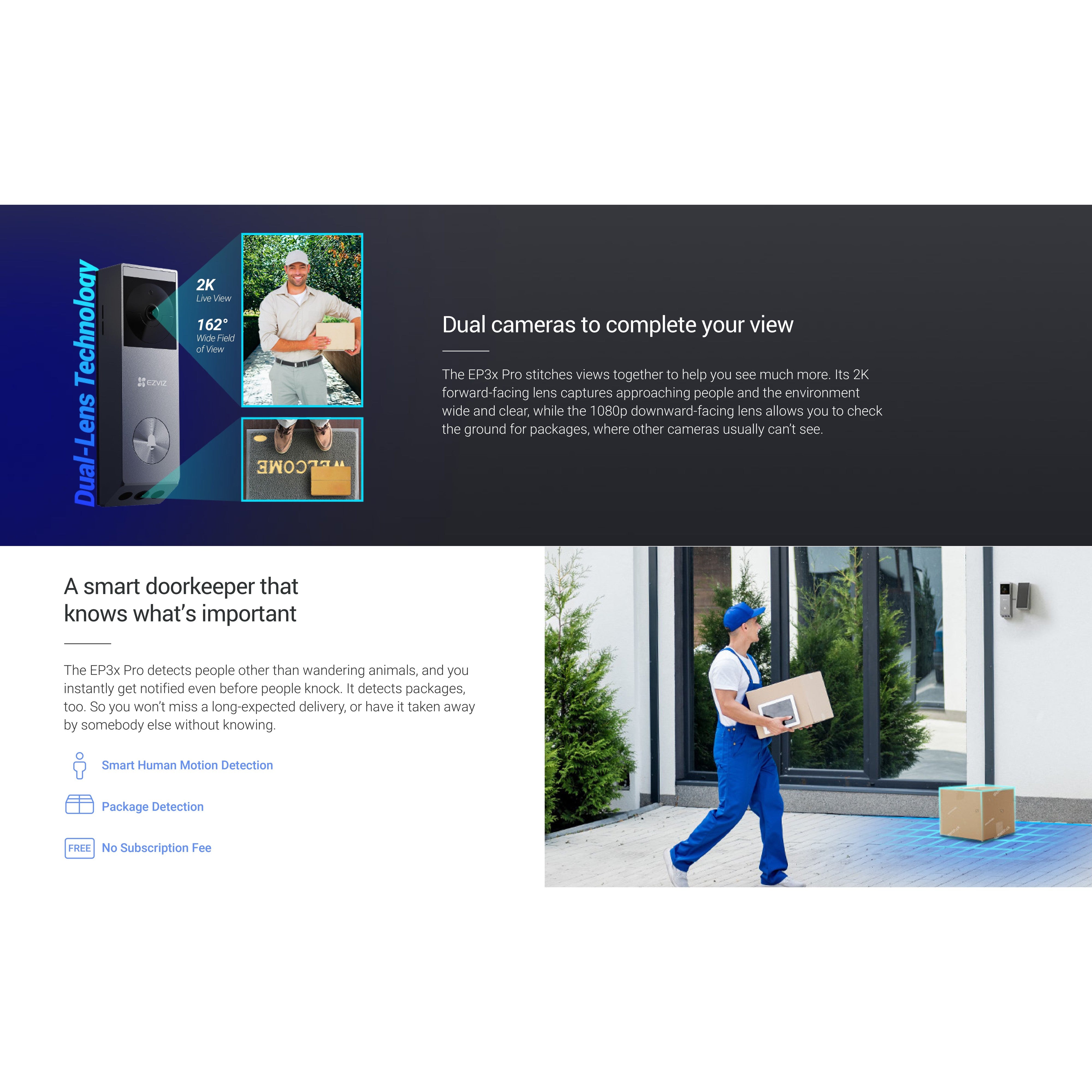 With the EP3x, a true head-to-toe view easily becomes a reality. Its forward-facing 2K lens captures your visitors and surroundings wide and clear, while the downward-facing 1080p lens checks your deliveries for you. With one single EP3x, it’s difficult to miss a detail due to the limited field of view, something many doorbells struggle with.