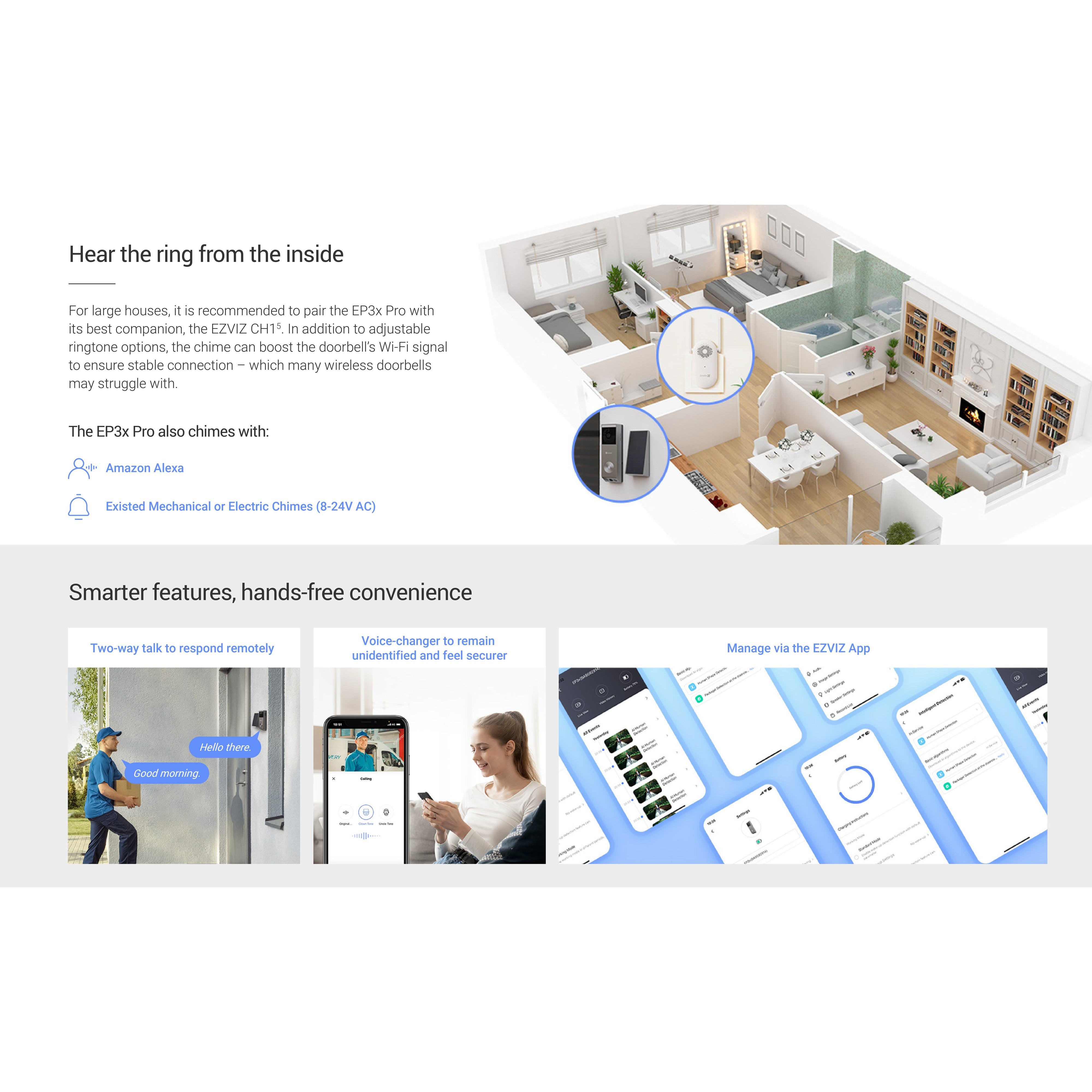 With the included indoor chime CH1, you can hear a pleasant ringtone even when you are far away from the front door in your bedroom. The chime also serves as a Wi-Fi booster for your EP3x, ensuring that the doorbell stays online with a more stable network connection despite the thick walls between it and your home router.