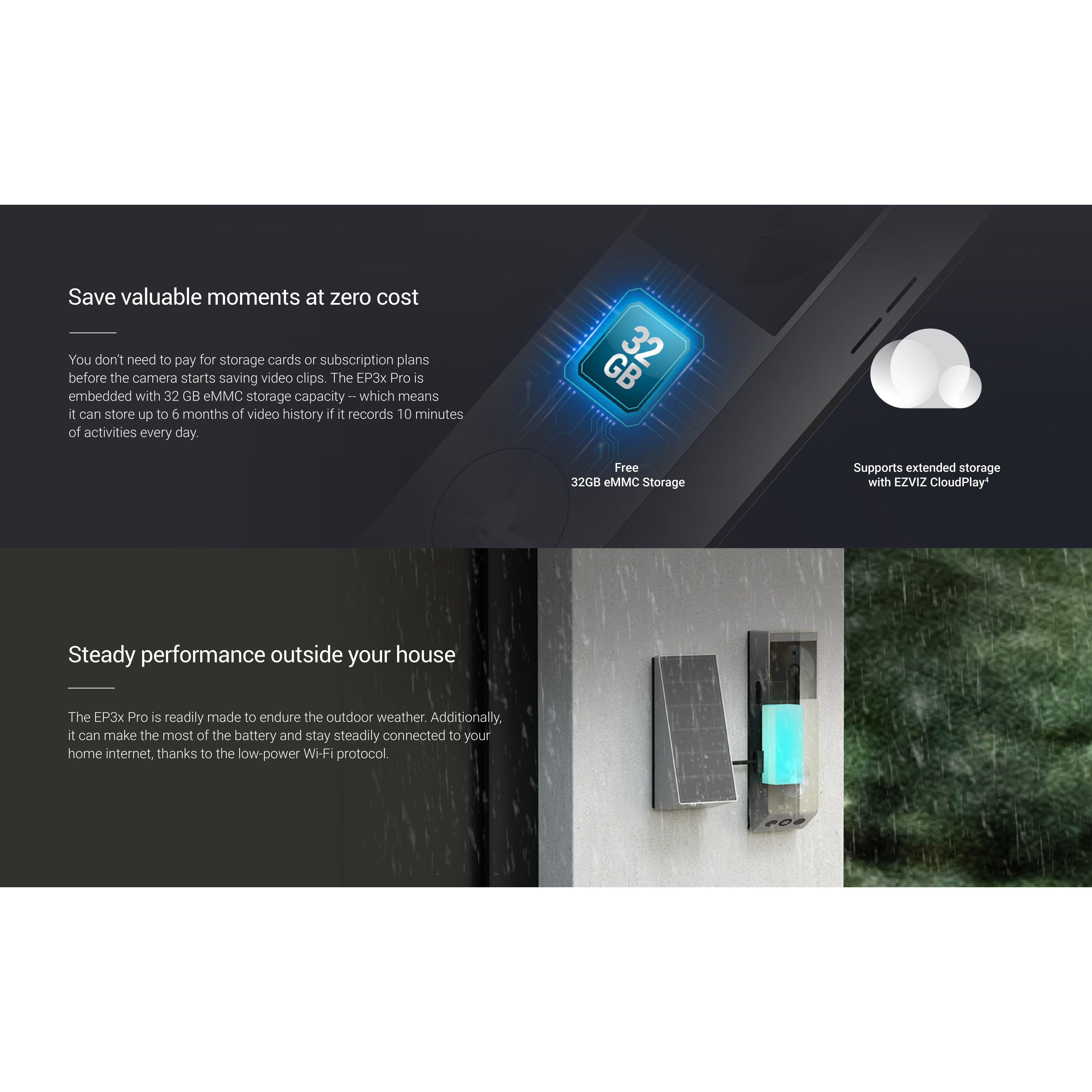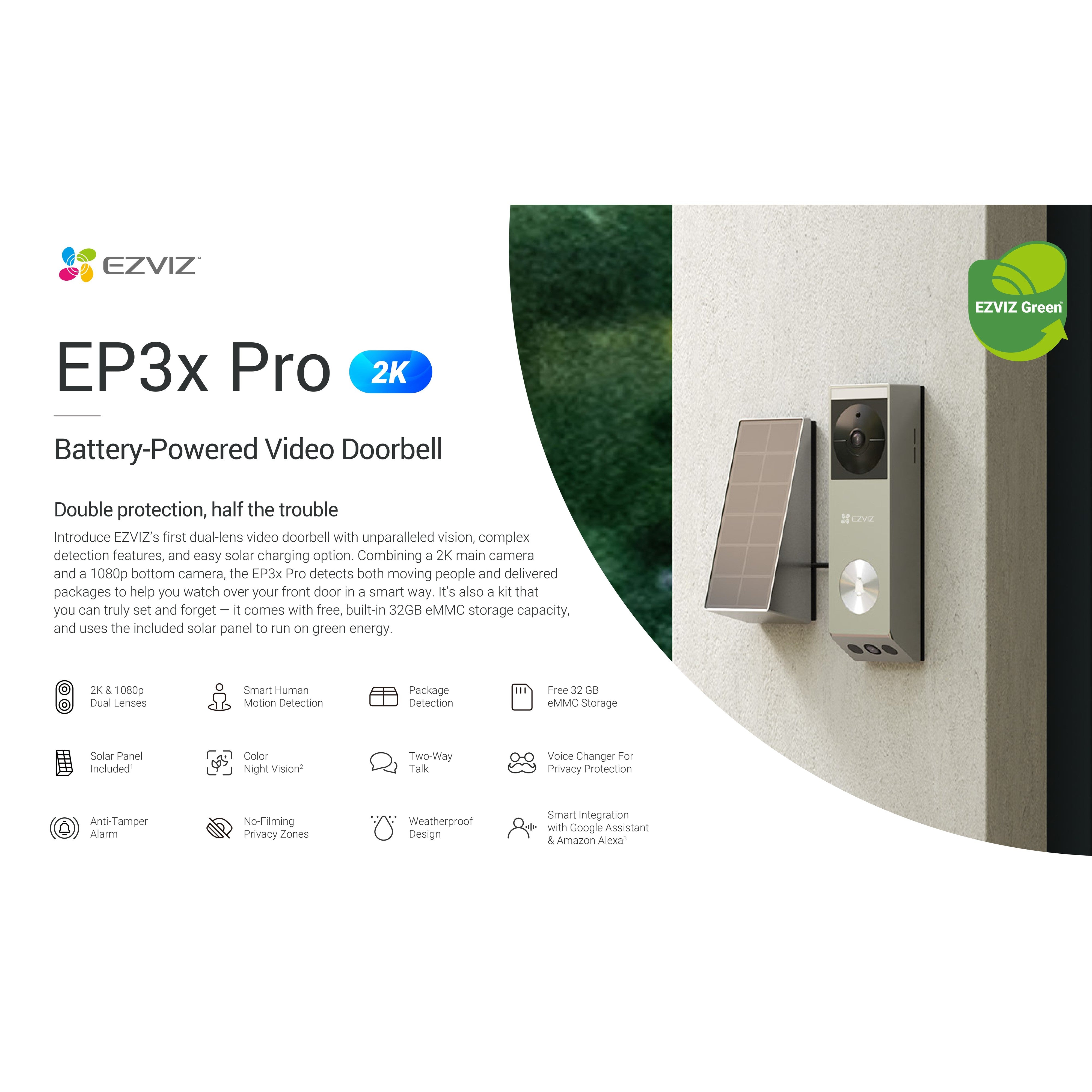 If you want to make your front door accessible via your mobile phone, opt for the latest EP3x. Thanks to its innovative dual camera design, the EP3x allows you to see visitors at the front and packages on the ground, all at the same time even remotely. Combining both camera and doorbell functions, this 2-in-1 device enhances the security of your home as a 24/7 guardian – it can detect people and alert you to a visitor, send a video call from a delivery man, and play a pleasant ringtone from its pairing chime. 100% wire-free and battery-powered, the EP3x is almost effortless to set up and use for all.