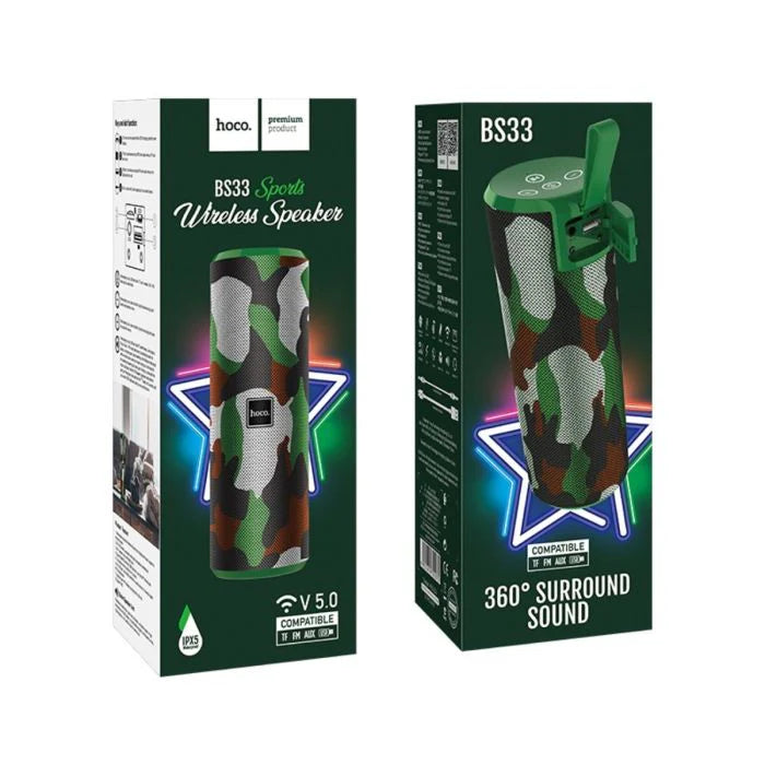 Experience unparalleled audio with the Hoco BS33 Voice sports wireless speaker - Camouflage green. Perfectly designed for music lovers who demand style and quality, this wireless speaker is ideal for outdoor adventures and everyday use.
