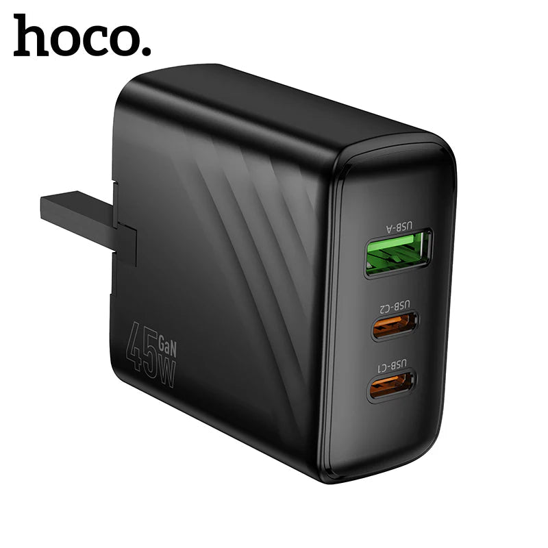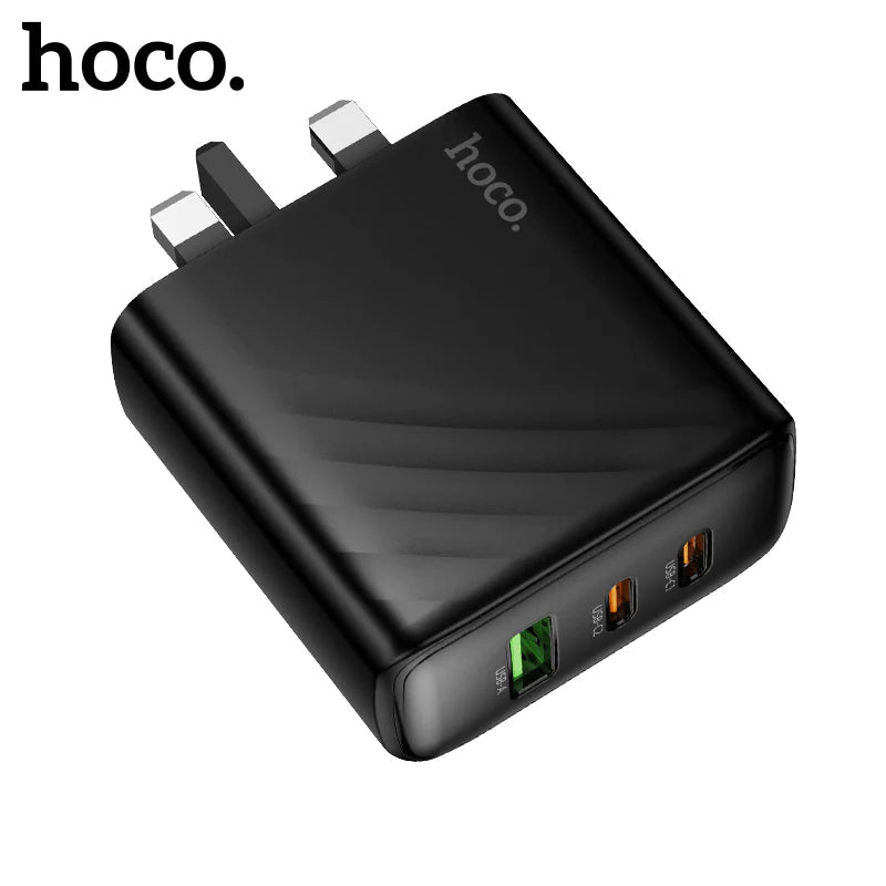 The Hoco CS26B PD45W wall charger is a compact and efficient charging solution with two USB-C ports and one USB-A port, allowing you to charge up to three devices simultaneously. With support for PD and QC3.0 fast charging protocols, this adapter delivers reliable performance for smartphones, tablets, and even some lightweight laptops.