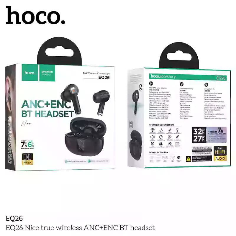 The HOCO EQ26 NICE is a premium pair of true wireless earbuds that delivers crystal-clear audio with powerful hybrid ANC (Active Noise Cancellation) and ENC (Environmental Noise Cancellation) for calls. Designed for music lovers and professionals alike, these earbuds offer seamless Bluetooth 5.3 connectivity, low latency, and a long-lasting battery life — all in a sleek, ergonomic form factor.