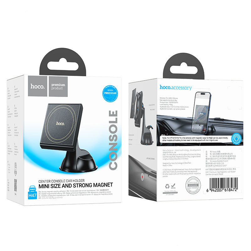 The HOCO H47 Precious ring magnetic car holder features a combination of ABS, silicone, and PU materials and a surface process of texturing and hot stamping. Measuring 100*65*92mm and weighing 86g, it is suitable for holding 4.5-7.0 inch mobile phones, particularly the iPhone 12-15 series. This car holder mounts directly onto the car's center console for easy access.