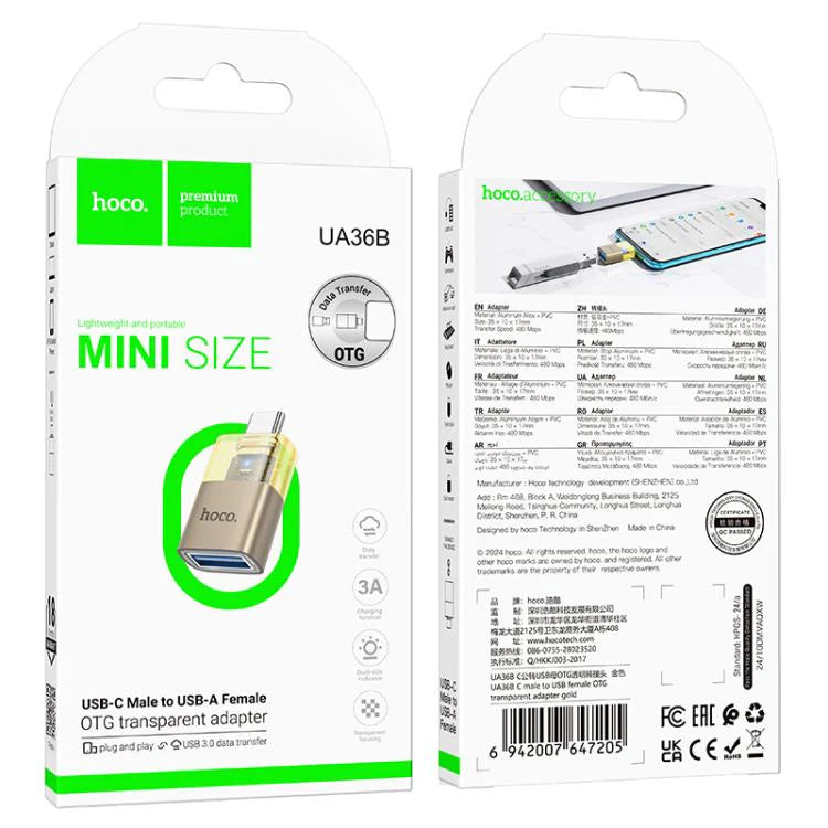 The Hoco UA36B is a handy USB-C / Type-C male to USB female OTG adapter in a stylish transparent gold design. Perfect for connecting USB flash drives, peripherals, and accessories to your Type-C devices like smartphones, tablets, and laptops. Compact, durable, and easy to carry wherever you go.