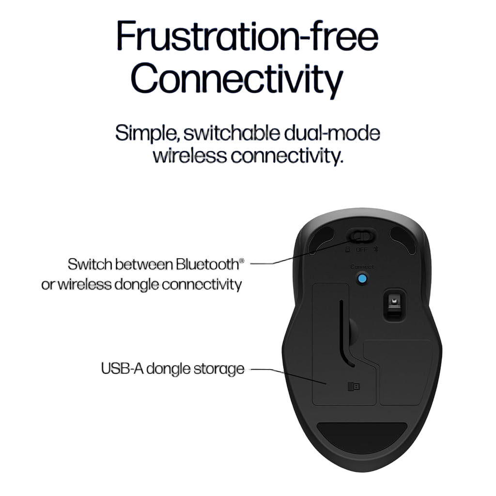 The HP 250 Dual Wireless Mouse offers precise control with up to 1600 DPI sensitivity, ideal for both professional and everyday use. Its dual wireless connectivity allows seamless switching between devices via Bluetooth and a USB receiver, enhancing productivity and convenience. Designed in sleek black, this mouse combines ergonomic comfort with reliable performance, making it a versatile accessory for any workspace. Its responsive tracking and durable build ensure consistent accuracy and long-lasting use. Perfect for users seeking a dependable, high-performance wireless mouse with flexible connectivity options.