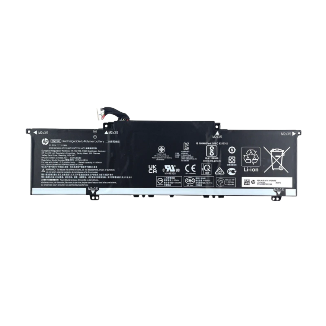 Provides reliable 11.55 V output, built-in safety protections and long backup life for your HP laptop. The HP BN03XL is a high-quality replacement battery designed for HP ENVY X360 13/15 series and select HP Envy 13/15 laptops. With an 11.55 V output and 51Wh capacity, this 3-cell Li-ion battery offers reliable backup power and consistent performance. Built with premium cells and integrated safety protections for overheating, overcharging, and power surges, it ensures your laptop works smoothly and safely for extended periods.