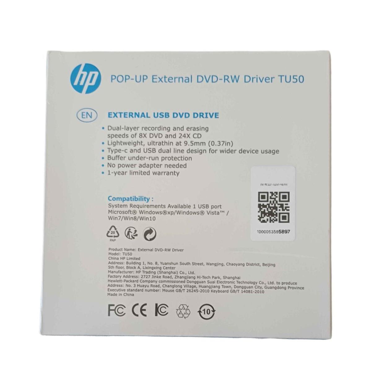 The HP Pop-up External DVD-RW Driver TU50 offers a reliable and portable solution for reading and writing DVDs and CDs. Designed for easy connectivity, this external drive supports a wide range of disc formats, making it ideal for data backup, media playback, and software installation. Its compact, pop-up design enhances portability without compromising performance, perfect for professionals who need a dependable optical drive on the go. Compatible with various operating systems, the TU50 ensures seamless integration with your laptop or desktop, providing expert-level functionality in a sleek, user-friendly package.