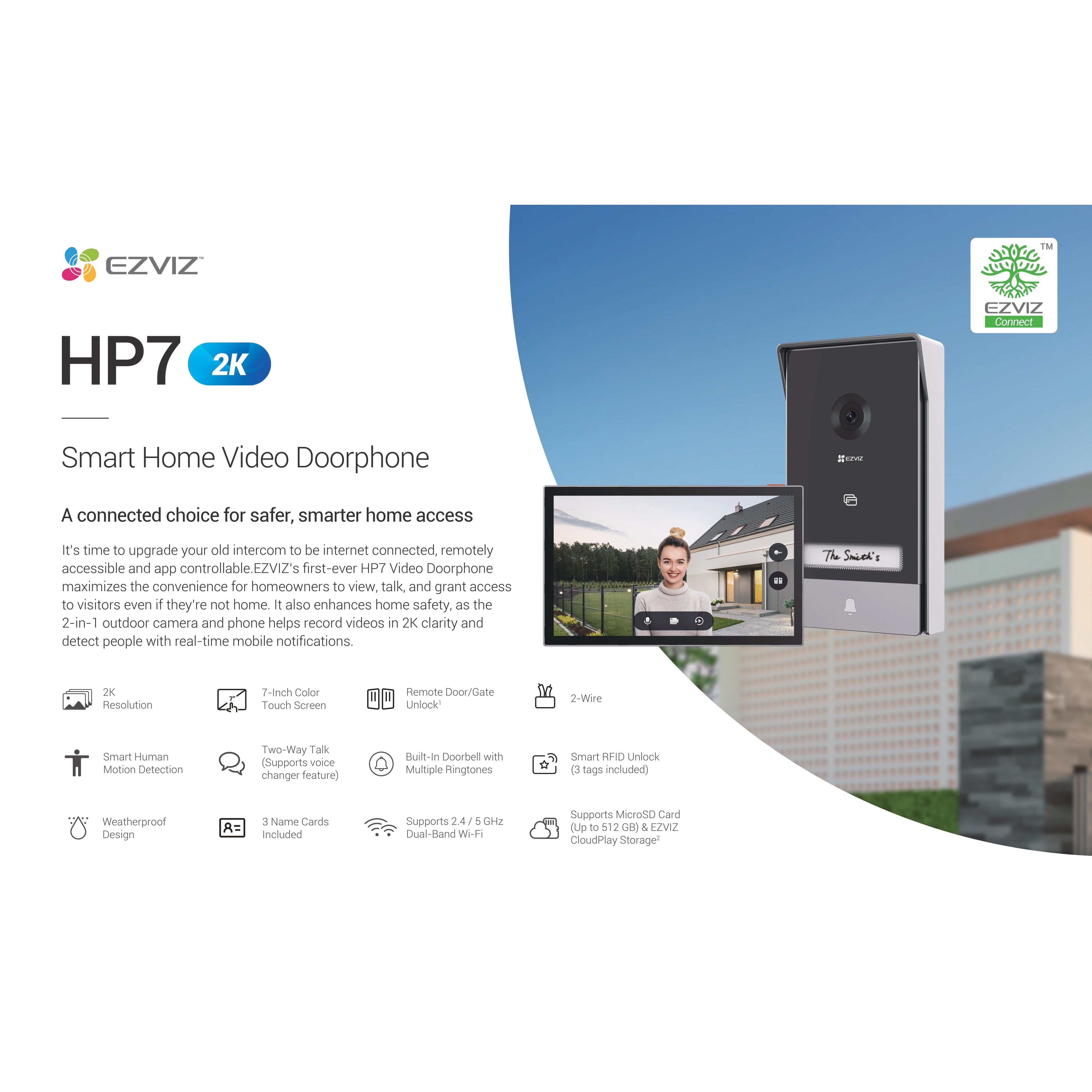 It’s time to upgrade your old intercom to be internet connected, remotely accessible and app controllable. EZVIZ’s first-ever HP7 Video Door phone maximizes the convenience for homeowners to view, talk, and grant access to visitors even if they’re not home. It also enhances home safety, as the 2-in-1 outdoor camera and phone helps record videos in 2K clarity and detect people with real-time mobile notifications.