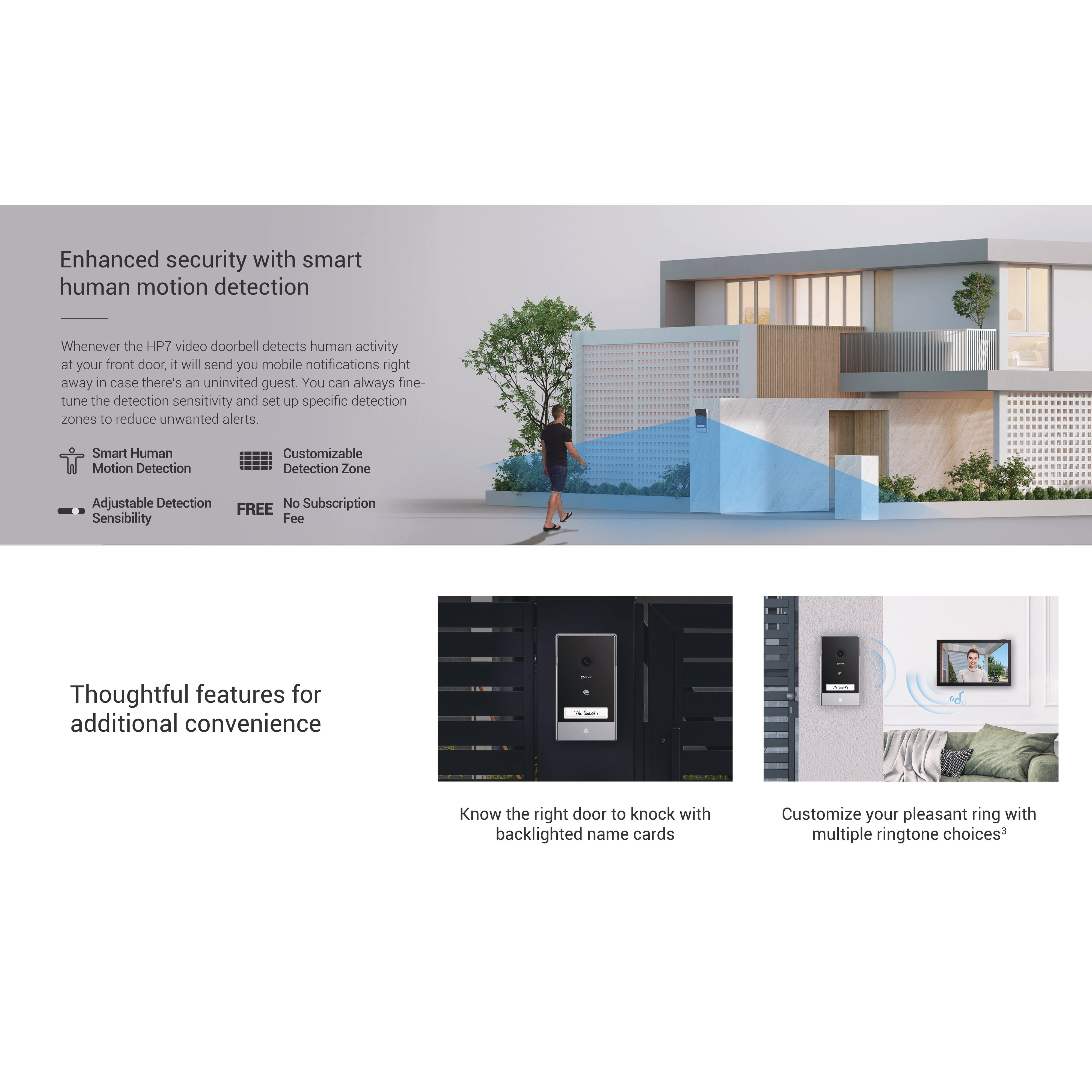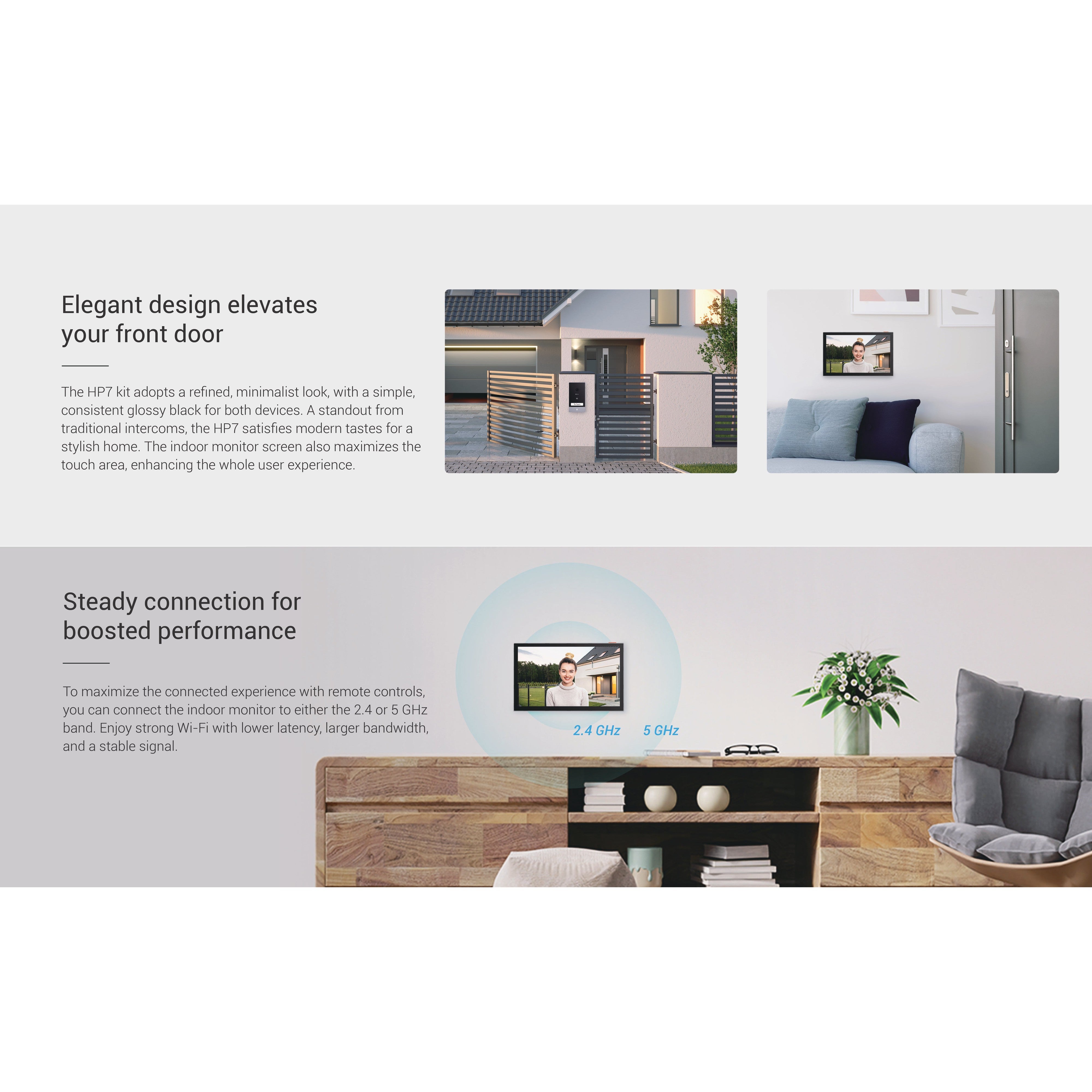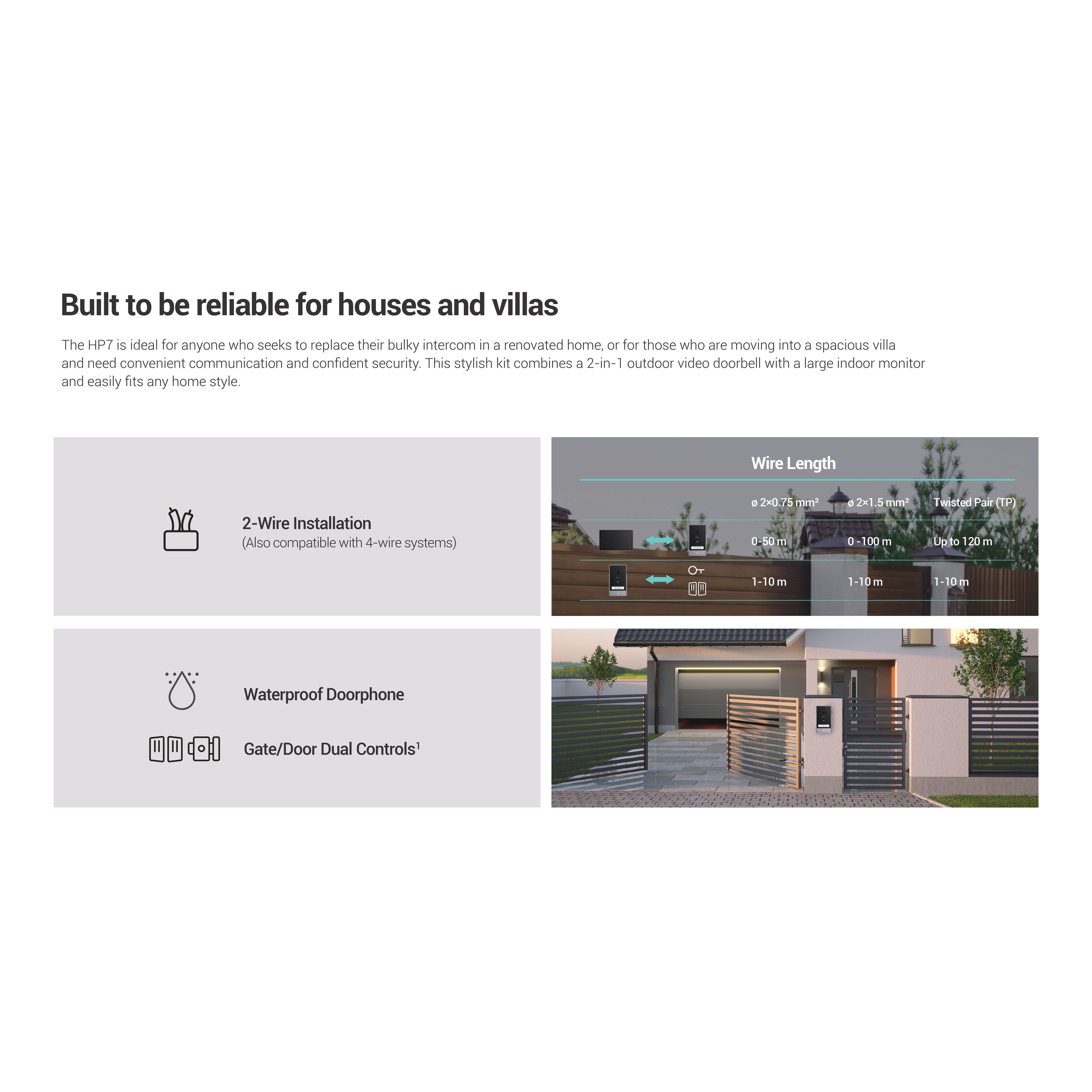 The HP7 is ideal for anyone who seeks to replace their bulky intercom in a renovated home, or for those who are moving into a spacious villa and need convenient communication and confident security. This stylish kit combines a 2-in-1 outdoor video doorbell with a large indoor monitor and easily fits any home style.