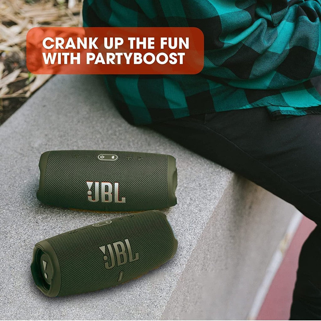 Take the party with you no matter what the weather. The JBL Charge 5 speaker delivers bold JBL Original Pro Sound, with its optimized long-excursion driver, separate tweeter and dual pumping JBL bass radiators. Up to 20 hours of playtime and a handy power bank to keep your devices charged to keep the party going all night. Rain? Spilled drinks? Beach sand? The IP67 waterproof and dustproof Charge 5 survives whatever comes its way. Thanks to PartyBoost, you can connect multiple JBL PartyBoost-enabled speakers for a sound big enough for any crowd. With all-new colors inspired by the latest street fashion trends, it looks as great as it sounds.