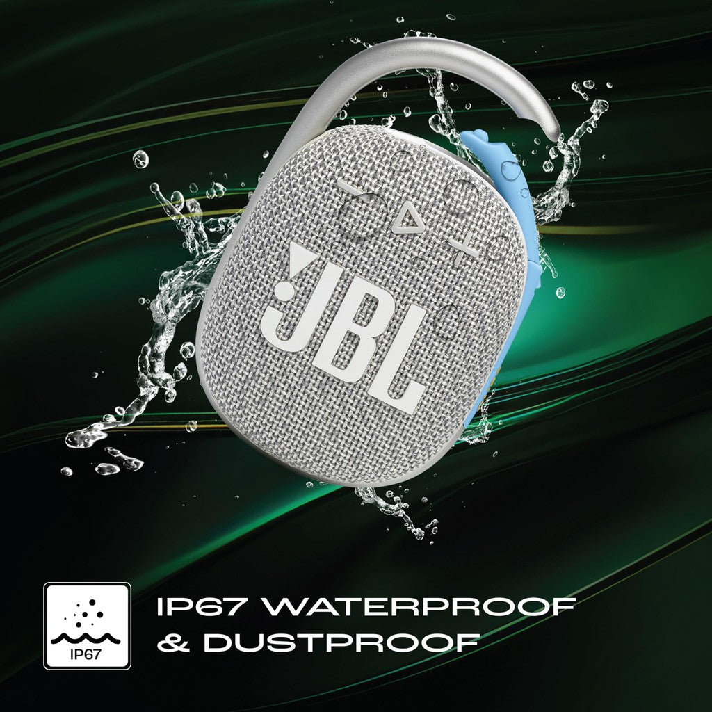 Cool, portable, and waterproof. The vibrant fresh looking JBL Clip 4 delivers surprisingly rich JBL Original Pro Sound in a compact package. The unique oval shape fits easy in your hand. Fully wrapped in colorful fabrics with expressive details inspired by current street fashion, it’s easy to match your style. The fully integrated carabiner hooks instantly to bags, belts, or buckles, to bring your favorite tunes anywhere. Waterproof, dustproof, and up to 10 hours of playtime, it’s rugged enough to tag along wherever you explore.
