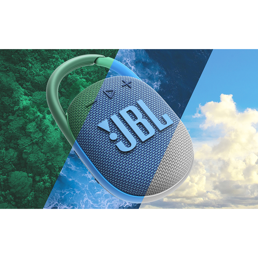 New innovative, eco-friendly design—same big audio performance. Help make the world a little greener with a must-have accessory for your next outing, made from up to 90% post-consumer recycled plastic and wrapped in 100% recycled fabric on the speaker grille. The vibrant fresh looking JBL Clip 4 Eco delivers surprisingly rich JBL Original Pro Sound in a compact package. The unique oval shape fits easy in your hand. The fully integrated carabiner hooks instantly to bags, belts, or buckles, to bring your favorite tunes anywhere. Waterproof, dustproof, and up to 10 hours of playtime, it’s rugged enough to tag along wherever you explore.