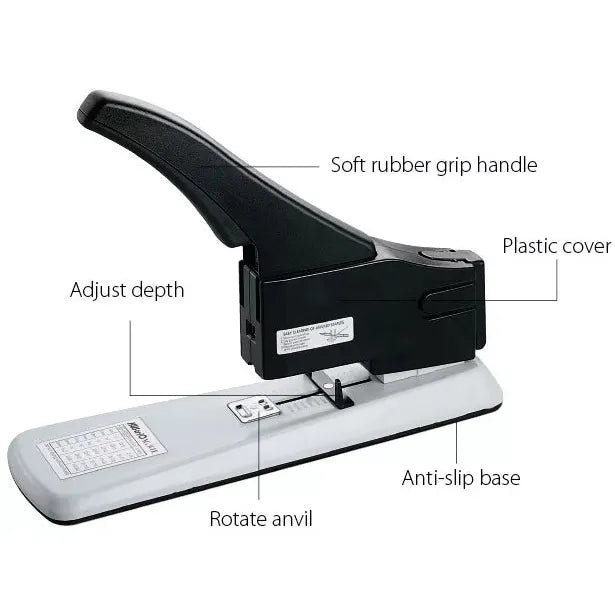 The KW-TriO® Deluxe Heavy Duty Stapler Model No. 050SE is designed to meet the rigorous demands of professional environments. Built with a sturdy metal frame, it ensures exceptional durability and stability during heavy stapling tasks. This stapler can efficiently bind large volumes of paper, making it suitable for offices, schools, and administrative settings where high-capacity stapling is essential. Its precision-engineered mechanism delivers consistent staple placement with minimal effort, reducing hand fatigue during extended use. The ergonomic design enhances user comfort, while the easy-loading feature simplifies staple refills, ensuring uninterrupted workflow. This model combines reliability and performance for efficient document management.