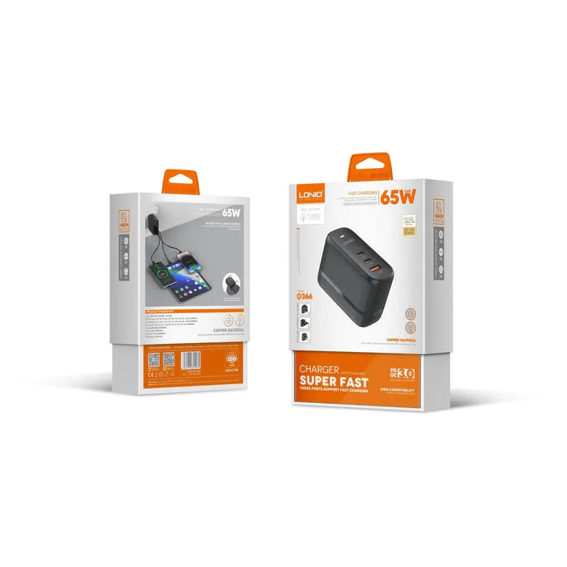 Meet the LDNIO Q366 – a powerful and compact 65W GaN fast charger with dual Type-C and one USB-A port. Ideal for charging laptops, smartphones, tablets, and more at blazing speed. Featuring GaN technology for improved heat dissipation and energy efficiency, this travel-friendly wall charger delivers intelligent power distribution to safely fast-charge all your essential devices.