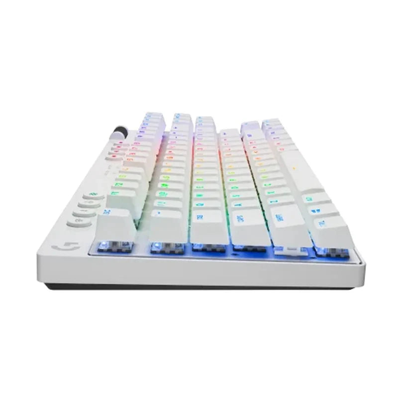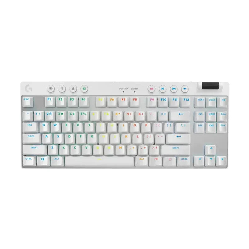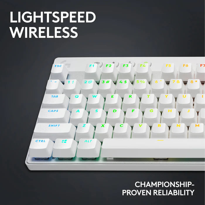 Designed for fast-paced gaming, the white Logitech G PRO X TKL LIGHTSPEED Wireless RGB Gaming Keyboard delivers high responsiveness and comfort while freeing you from being tethered to your computer. Featuring a space-saving ten keyless design and tactile switches that provide satisfying feedback, this keyboard provides the speed and reliability to take on the competition.