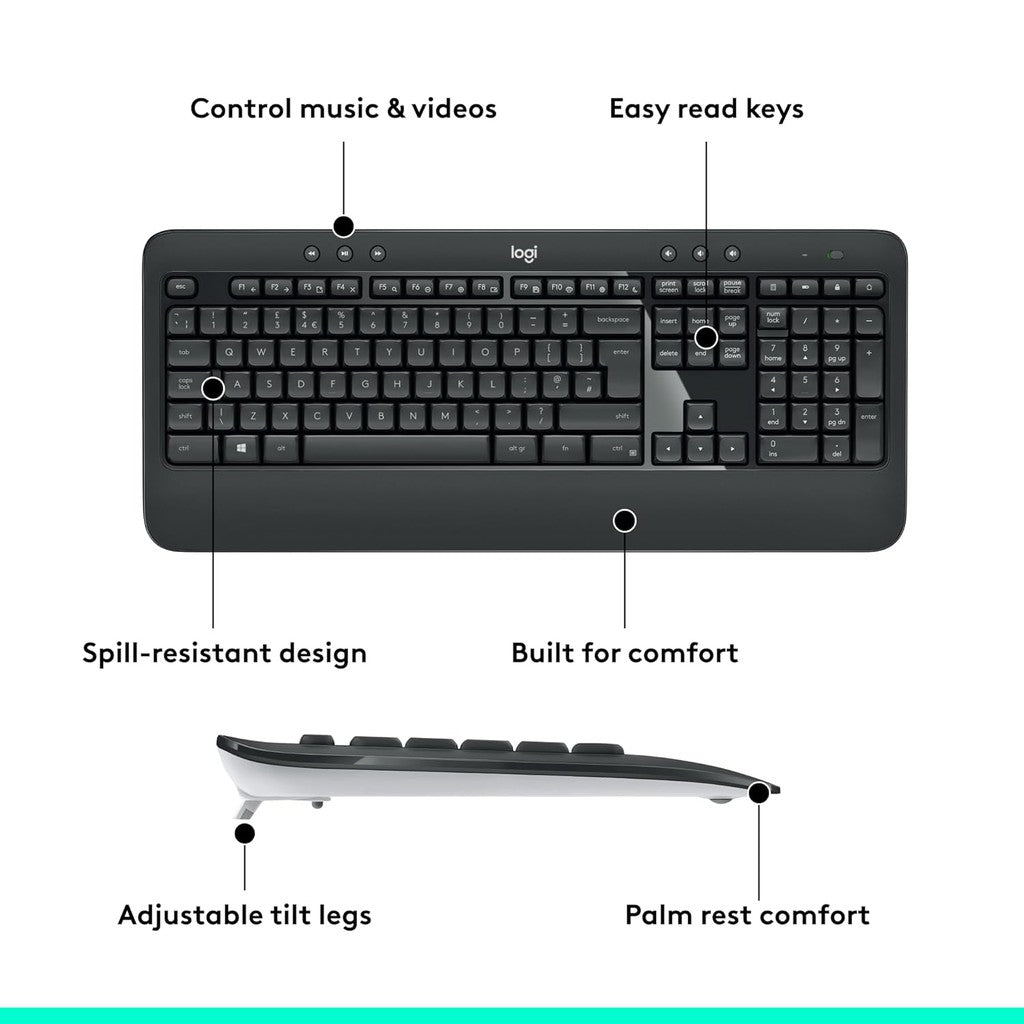 The MK540 Advanced is an instantly familiar wireless keyboard and mouse combo built for precision, comfort, and reliability. The full-size keyboard features a familiar key shape, size, and feeling – and the contoured and ambidextrous mouse has been designed to fit comfortably into either palm.