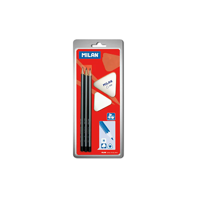 The Milan Blister 3 Pencil + Eraser + Sharpener Bym10013 set offers a comprehensive solution for writing, drawing, and correcting tasks. This thoughtfully curated kit includes three high-quality pencils designed for smooth and consistent graphite application, making them suitable for both detailed sketching and everyday writing.