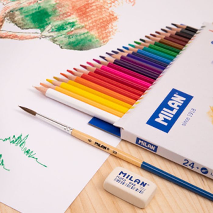 The Milan Set of 24 Triangular Colour Pencils 0742324 offers a comprehensive range of vibrant colors designed for precision and comfort. Its ergonomic triangular shape ensures a secure grip, reducing hand fatigue during extended use, making it ideal for detailed artwork and professional sketching. Each pencil features high-quality pigments that deliver smooth, consistent color application with excellent coverage.