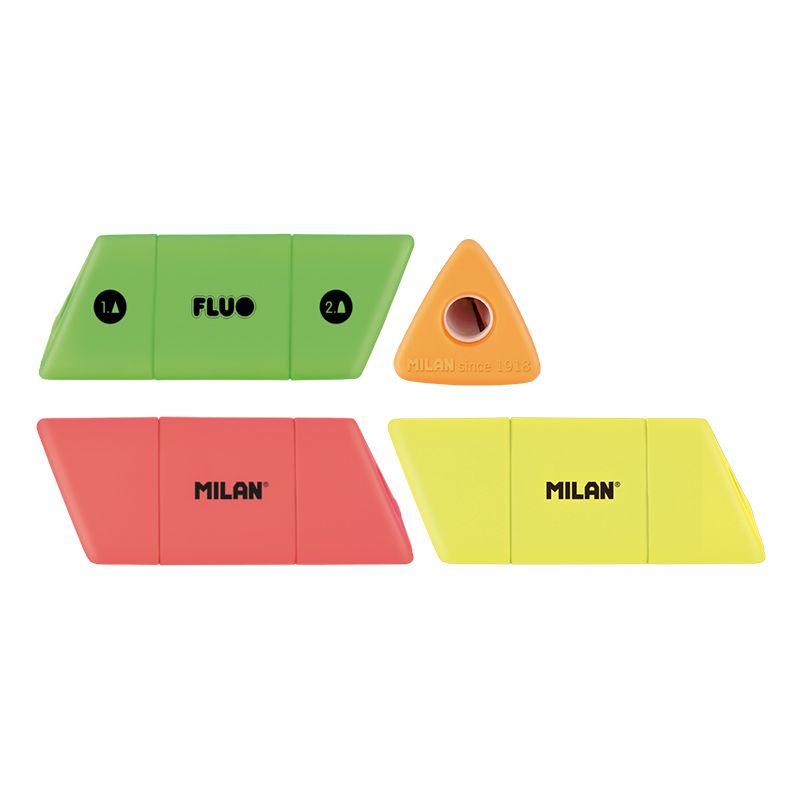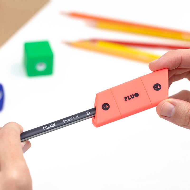 The Milan Slide Fluo Sharpener 20153212 is a precision tool designed for efficient and smooth sharpening of pencils. Its slide mechanism allows for easy disposal of shavings, ensuring a clean workspace.