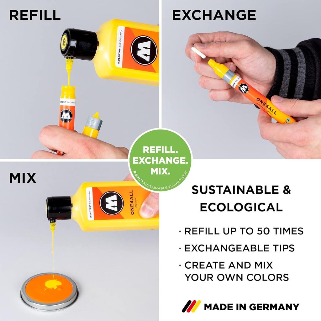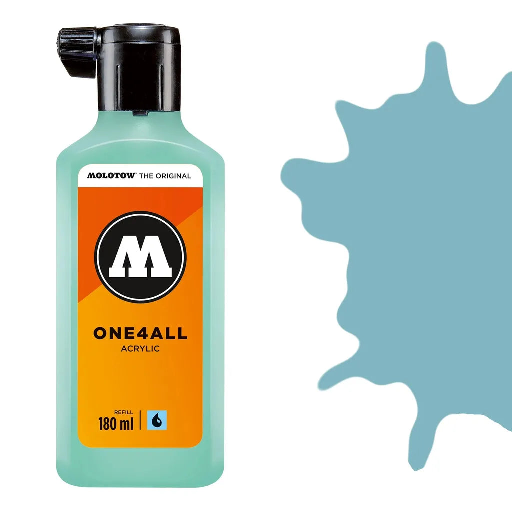 Molotow One 4 All Acrylic Paint Refill in Lago Blue Pastel offers a high-quality acrylic formula designed for seamless refilling of your Molotow marker system. This 180ml refill provides consistent, vibrant coverage with excellent opacity and durability, ideal for professional artists and creatives who demand precision and longevity in their work. The pastel blue shade adds soft, versatile color options suitable for various artistic styles and surfaces. Compatible with a range of markers, this refill ensures smooth flow and reliable performance, making it an essential supply for maintaining your acrylic painting tools at their best.