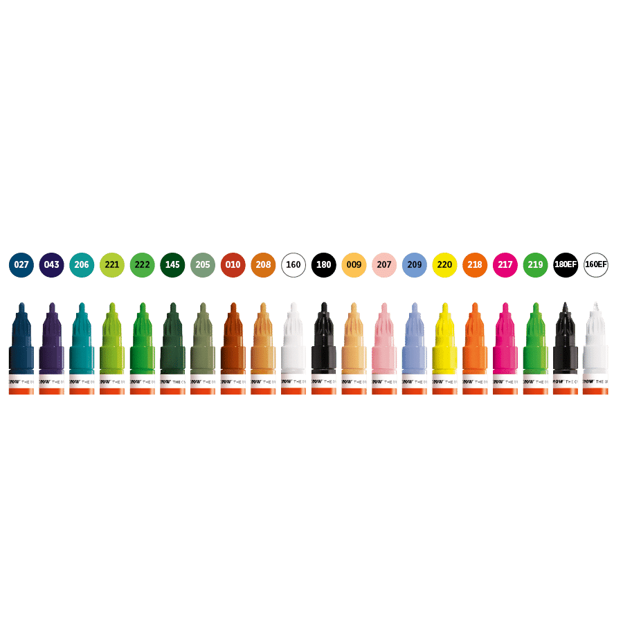 The Molotow One4all Acrylic Paint Marker Main Kit 2 features 20 high-quality 2mm acrylic markers designed for professional use. Each marker delivers vibrant, opaque colors with excellent covering power and UV resistance, ideal for detailed artwork, graffiti, and mixed media projects. The acrylic paint is water-based, fast-drying, and permanent on various surfaces including paper, metal, glass, wood, and plastic, providing lasting results. This kit is perfect for artists seeking precision and versatility with a broad color range, enabling smooth, consistent application for both fine lines and filling larger areas.