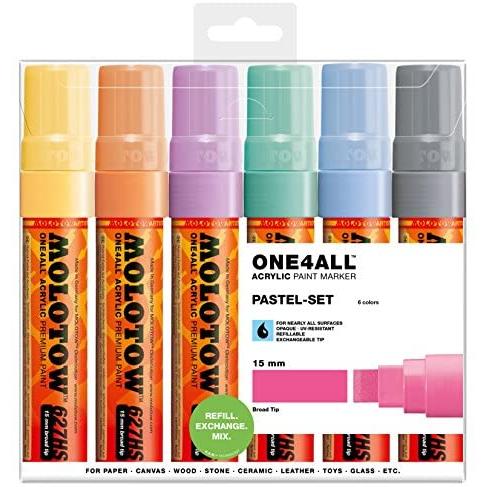 The Molotow One4all Acrylic Paint Marker Set includes six versatile pastel colors, each featuring a broad 15mm tip ideal for bold, expressive strokes.