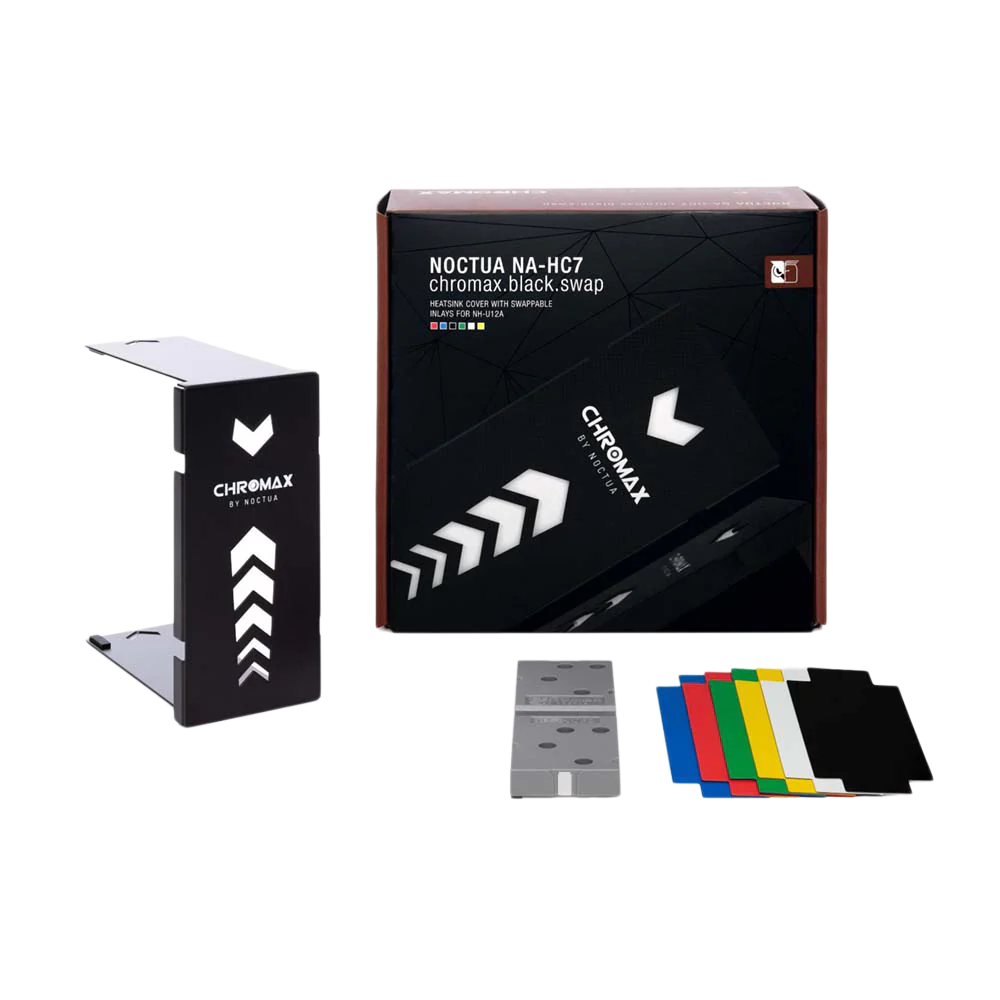 The NA-HC7chromax .black.swap heatsink cover is an add-on accessory for Noctua’s award-winning NH-U12A CPU coolers. Made from high-quality aluminium with black powder-coating finish and including swappable inlays in black, white, red, blue, green and yellow, it allows users to colour-customise the cooler in order to coordinate it with popular build colour schemes such as all black, black and white or black and red. Thanks to the easy, straightforward installation, changing the looks of your NH-U12A cooler only takes a few minutes and doesn’t even require taking it off the CPU. Combined with the chromax.black.swap edition Nf-A12X25 fan, the NA-HC7 gives you endless possibilities to design your very own, individual NH-U12A that looks just as great as it cools!