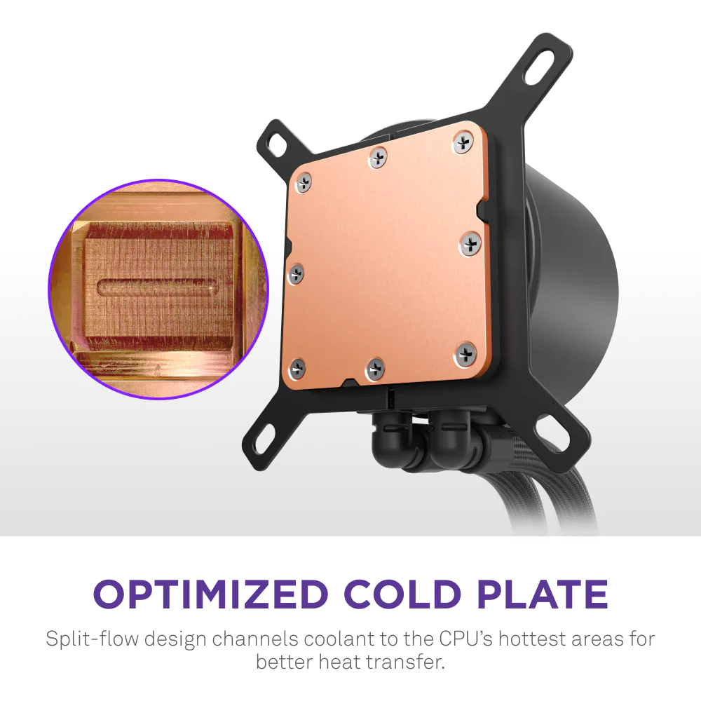 | Block Material (CPU Plate) | Copper base plate with split-flow design |