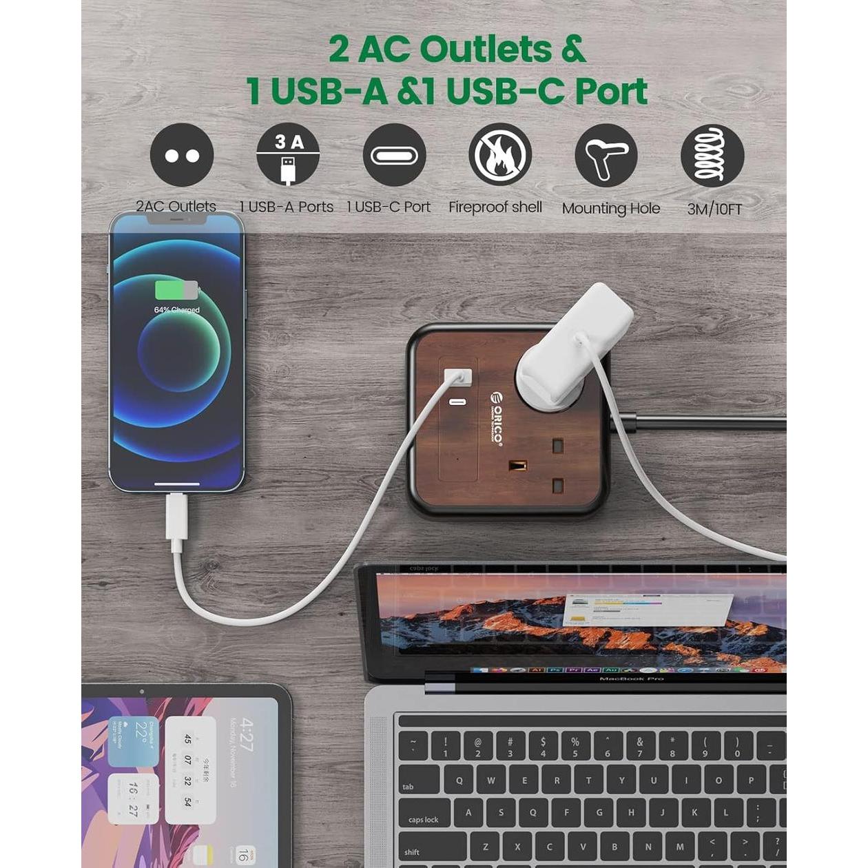 Inspiration of wood grain design and mounting on the wall : The power strip USB is inspired by nature, covered with wood grain, very natural and primitive, very suitable for interior decoration, with hanging holes on the back, suitable for home, office, bedroom, living room, The study and kitchen are waiting.