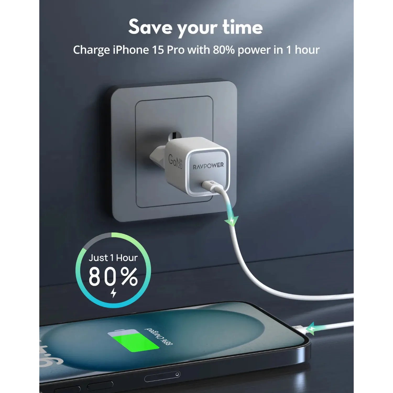 The Ravpower RP-PC1055 Mini PD 20W GaN Type-C Charger in white combines advanced Gallium Nitride technology with compact design, delivering fast and efficient charging in a portable form factor.