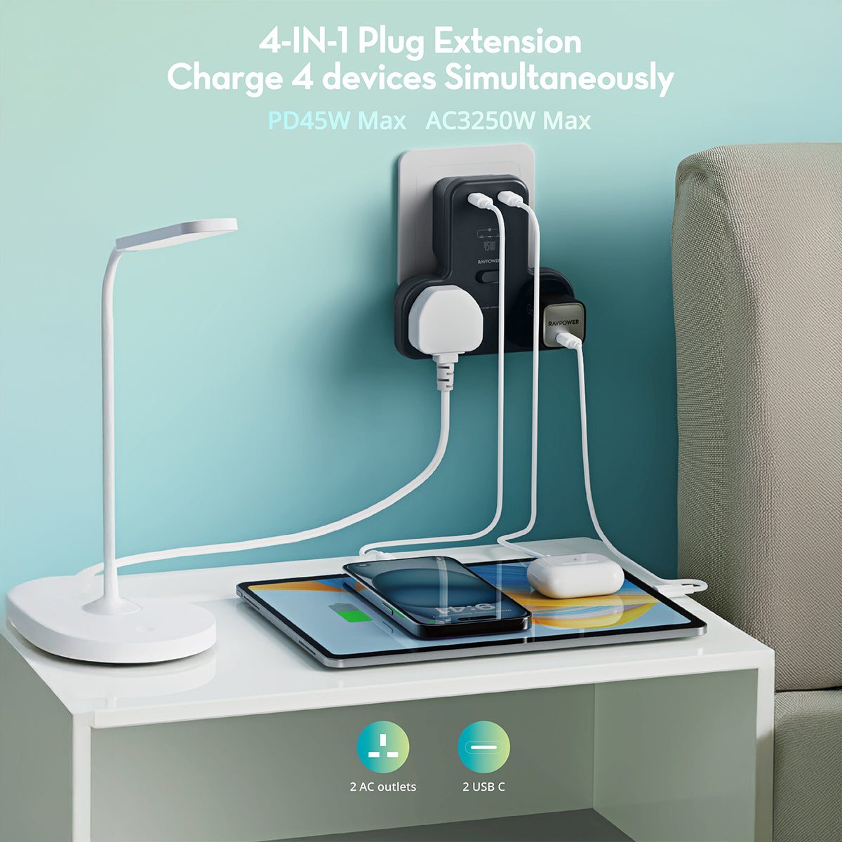 The Ravpower RP-PC1065 Gan 45W Power Outlet Extender is designed to enhance your workspace with versatile charging options. Equipped with 2 AC outlets and 2 USB-C ports, it supports efficient power delivery for multiple devices simultaneously. Its GaN technology ensures compact size while delivering up to 45W output, ideal for laptops, smartphones, and other electronics.