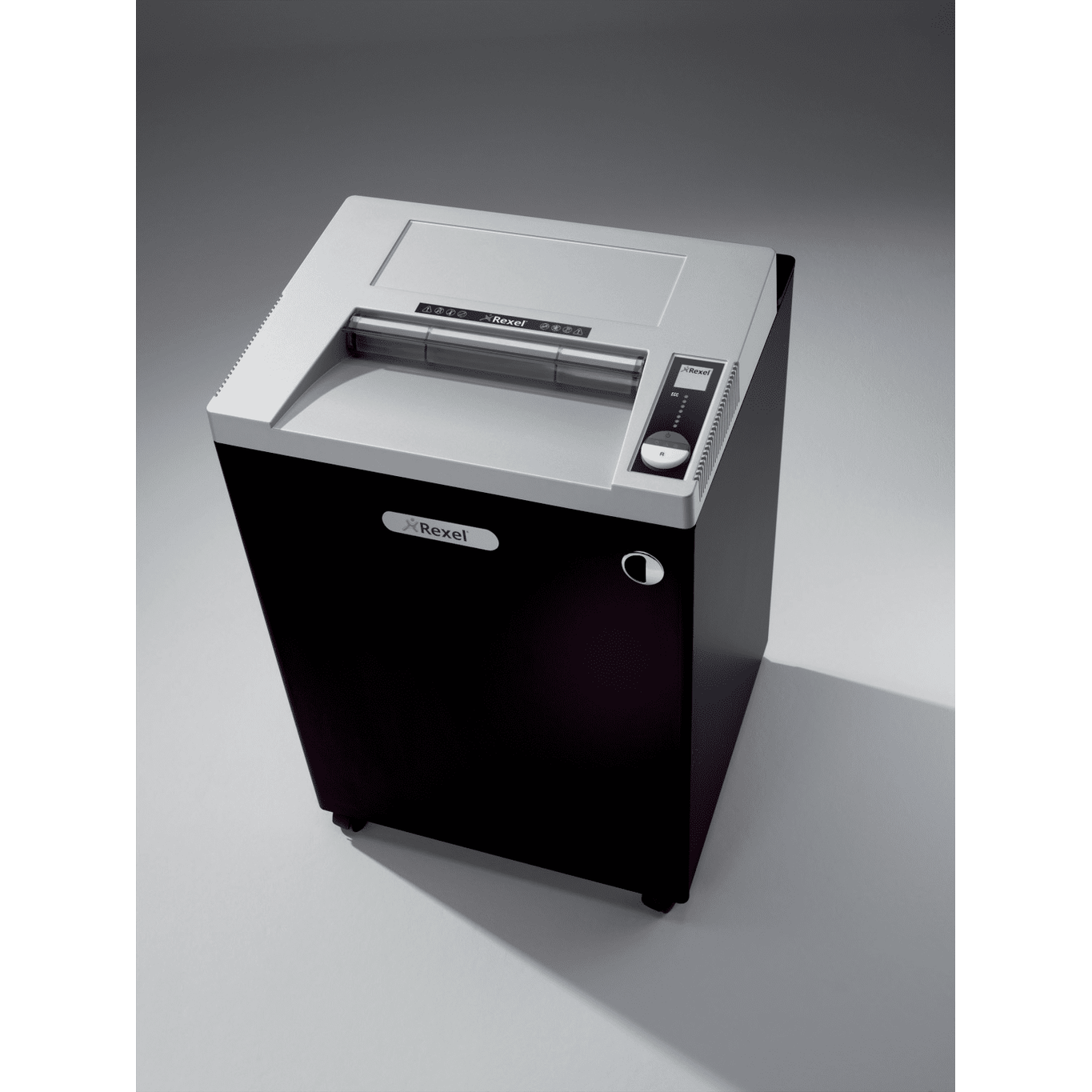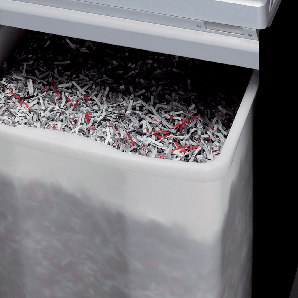 Ideal for high volume, bulk use and offering sufficient Cross-cut cut security to shred confidential documents, this shredder features Jam Stopper technology, a wide entry mouth to take up to A3 paper and cuts out automatically when the massive 175 litre capacity plastic bin is full. Protect your confidential and valuable information from being stolen by shredding any documents that may put your business at risk from identity fraud. The Rexel RLWX25 a multi department shredder designed to for high volume use with multiple users and has a P-4 security level which means that it shreds paper into unreadable Cross-cut style particles (sized 4 x 40mm) making it ideal for sensitive data. The RLWX25 is a wide entry (mouth size 400mm) shredder that can shred documents in all shapes and sizes including A4, A3 and computer listing paper, as well as staples, paper clips and credit cards. The anti-jam function reverses paper out of the shredder when too much paper is fed in. Engineered for bulk shredding, it can shred up to 28 sheets of 70gsm paper (25 at 80gsm) in a continuous single feed and features a super large 175 litre capacity plastic waste bin.