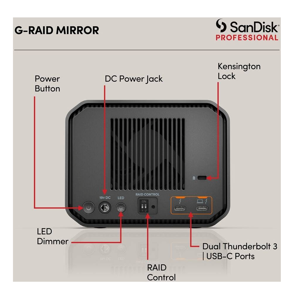 SanDisk 36TB Professional G-RAID MIRROR Thunderbolt 3 USB-C HDD delivers enterprise-grade storage performance for demanding creative professionals. This dual-drive RAID system provides 36TB of mirrored capacity, ensuring automatic data redundancy and protection against single-drive failure. With Thunderbolt 3 connectivity, achieve blazing-fast 260MB/s transfer speeds for seamless 4K and 8K video workflows, large-scale photo libraries, and intensive data operations. The G-RAID MIRROR architecture maintains real-time data duplication across both drives, offering peace of mind for mission-critical projects. Built for studios, post-production facilities, and content creators who demand reliability without compromising speed. Includes Thunderbolt 3 and USB-C compatibility for flexible integration into modern production environments.