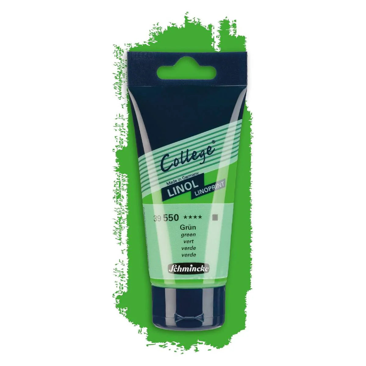 Schmincke College Linol Color offers professional-grade linoleum printing ink in a vibrant green hue, ideal for artists and printmakers seeking reliable color consistency.