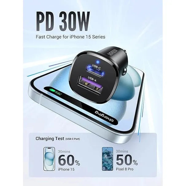 The UGREEN 30W 2-Port Fast Car Charger (Space Grey) EC305 delivers efficient dual-device charging for your vehicle. Equipped with 30W total output power, this compact charger supports simultaneous fast charging of two smartphones or tablets, making it ideal for long drives and daily commutes. The intelligent power distribution automatically optimizes charging speed based on connected devices, ensuring safe and efficient energy delivery. Built with advanced safety features including over-current, over-voltage, and temperature protection, it safeguards your devices from electrical hazards. The sleek space grey design complements modern car interiors while the compact form factor fits seamlessly into standard 12V car sockets. Compatible with most USB-powered devices, this charger combines practicality with reliability for drivers who demand consistent performance on the road.