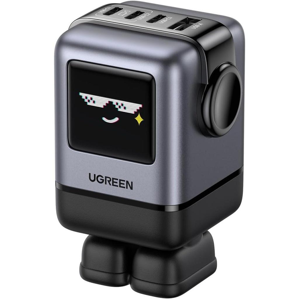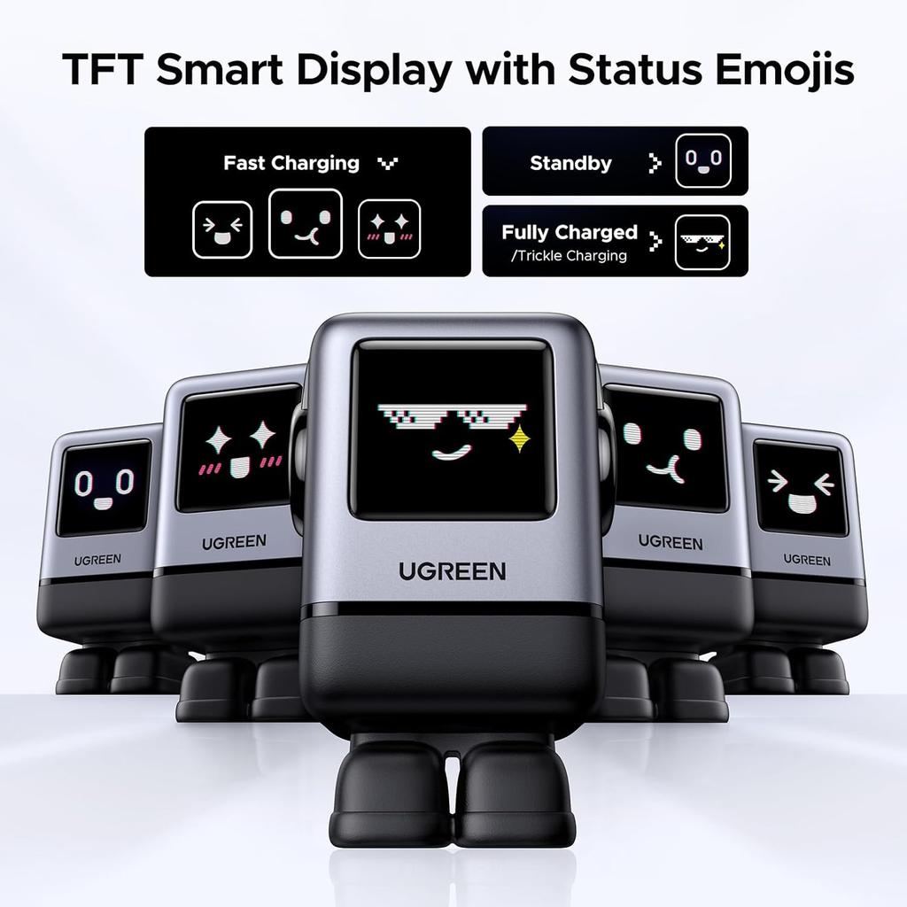 - Groovy Robot Design: UGREEN creative series charger, robot shape, TFT screen upgraded from LED, so it shows more interesting expressions according to different charging status. Its feet are magnetic which can be stuck to the laptops without losing it( Note: The expression will only appear when the power is on.)