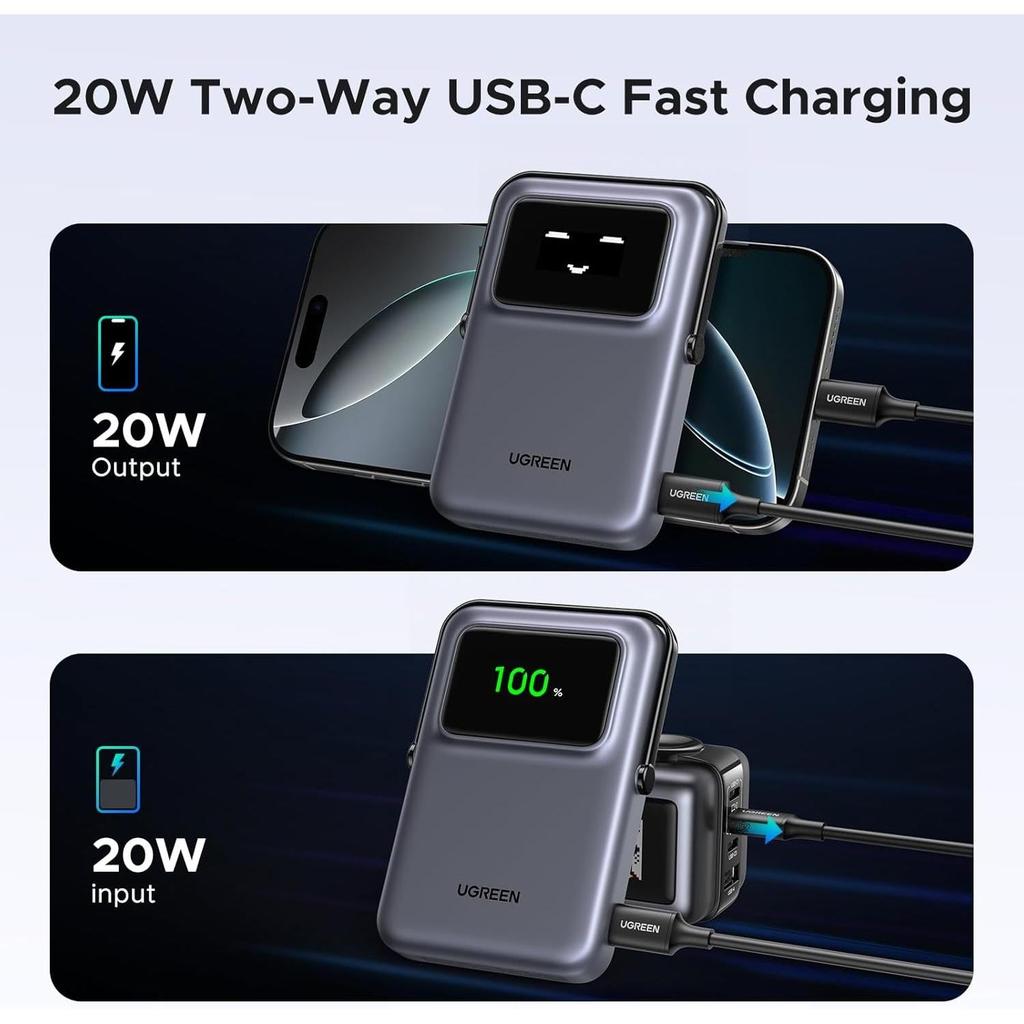 - Wireless and Wired Charging: Ugreen battery bank offers 7.5W magnetic charging, while also supporting PD 20W wired charging. It combines convenience and power to ensure you can power two devices at the same time