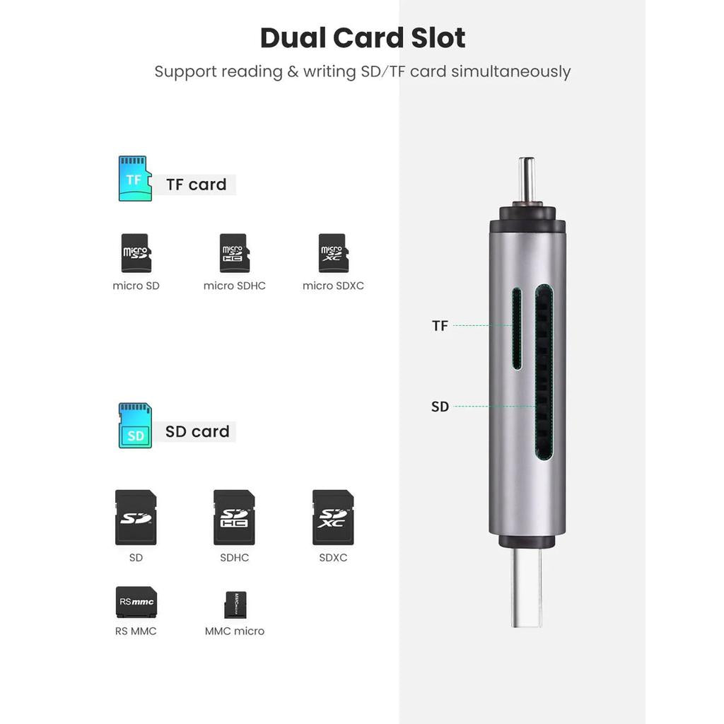 | Special Features | 2 in 1 Integrated Design: USB C & USB A SD card reader adapter with SD and Micro SD card slots allows you to connect your Type C and USB A devices more conveniently, such as compatible with iPhone 16 15 Pro/Pro Max, laptops, USB C smartphones and USB C tablets 5Gbps Speedy Access: Mirco SD Card Reader USB C supports transfers at 10x the speed of a USB 2.0 card reader, allowing you easily transfer 1G files in seconds 2 Cards Work Simultaneously: UGREEN USBC SD Card Reader is able to read SD and microSD cards at the same time, which helps to avoid repeatedly plugging/unplugging and improves your efficiency Universal Compatibility: SD card reader USB C applicable for SD/SDHC/SDXC/MMC/RS-MMC/Micro SD/Micro SDHC/Micro SDXC/UHS-I memory cards up to 2TB Fashionable & Portable: UGREEN Memory Card Reader made of wear-resistant metal is a great idea for carrying around, whether for office or travel. The aluminum shell facilitates fast heat dissipation and extended life Easy to Use: USB C to Micro SD Card Adapter plug and play for Windows, Mac OS, Linux, Chrome OS, iPad, Android, etc |
