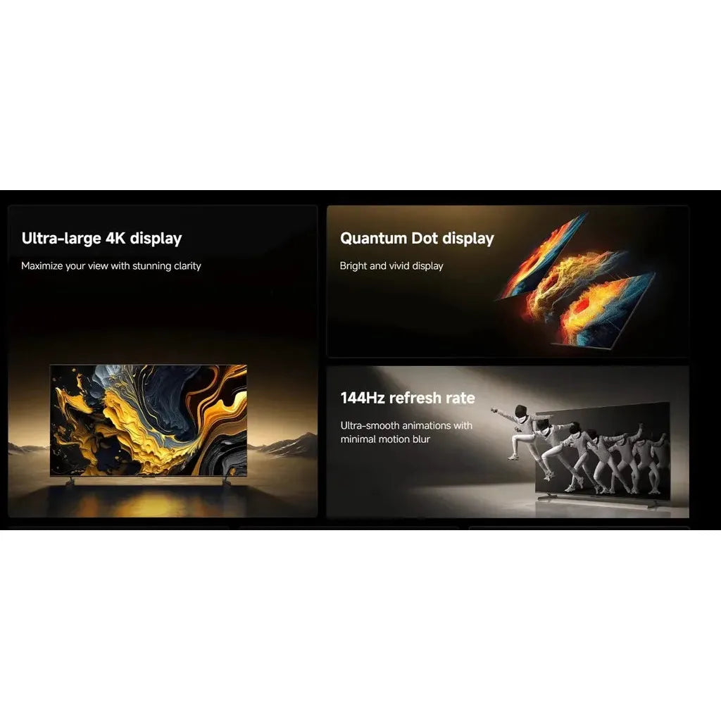 Experience unparalleled visual clarity with the Xiaomi TV Max 100, featuring a massive 100-inch 4K QLED display that delivers vibrant colors and deep contrasts. Its 144Hz refresh rate ensures ultra-smooth motion, ideal for fast-paced content and gaming. Equipped with HDMI 2.1, USB 2.0 and 3.0 ports, Bluetooth, Wi-Fi, and LAN connectivity, this smart TV offers versatile options for seamless device integration and streaming. The sleek dark gray design complements any modern living space, making it a premium choice for immersive entertainment and advanced connectivity.
