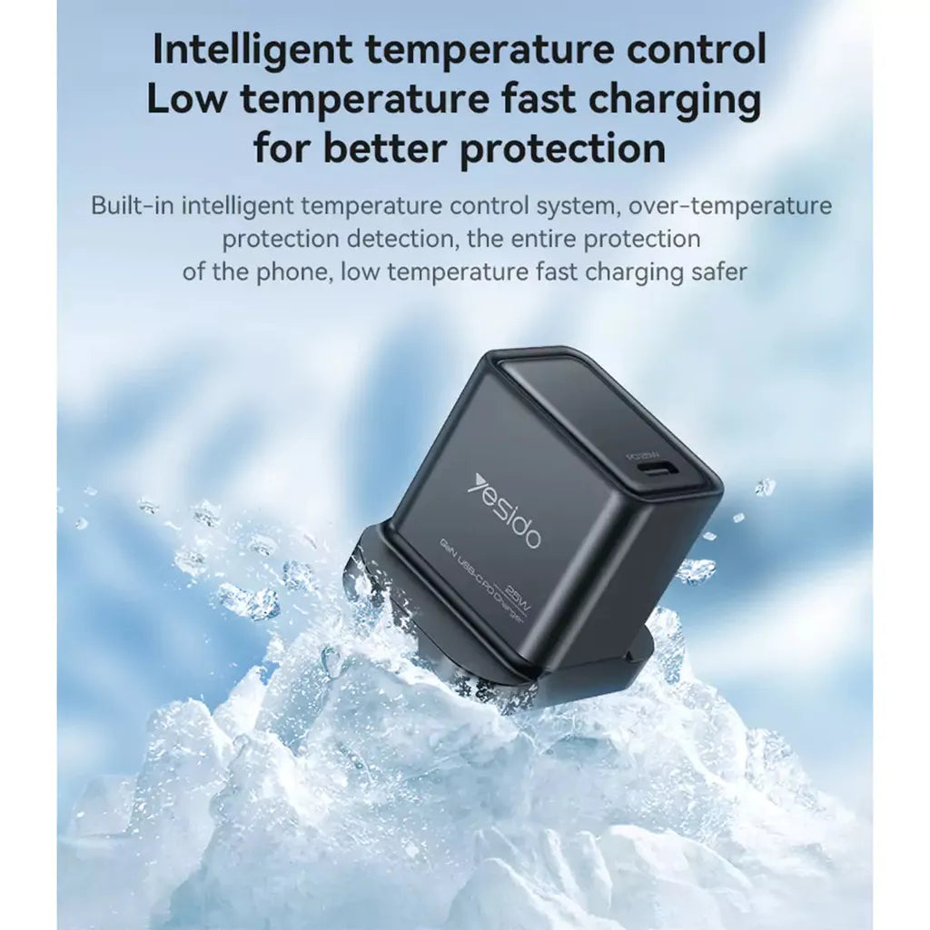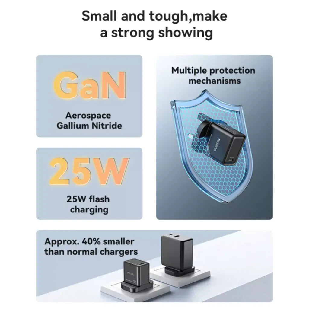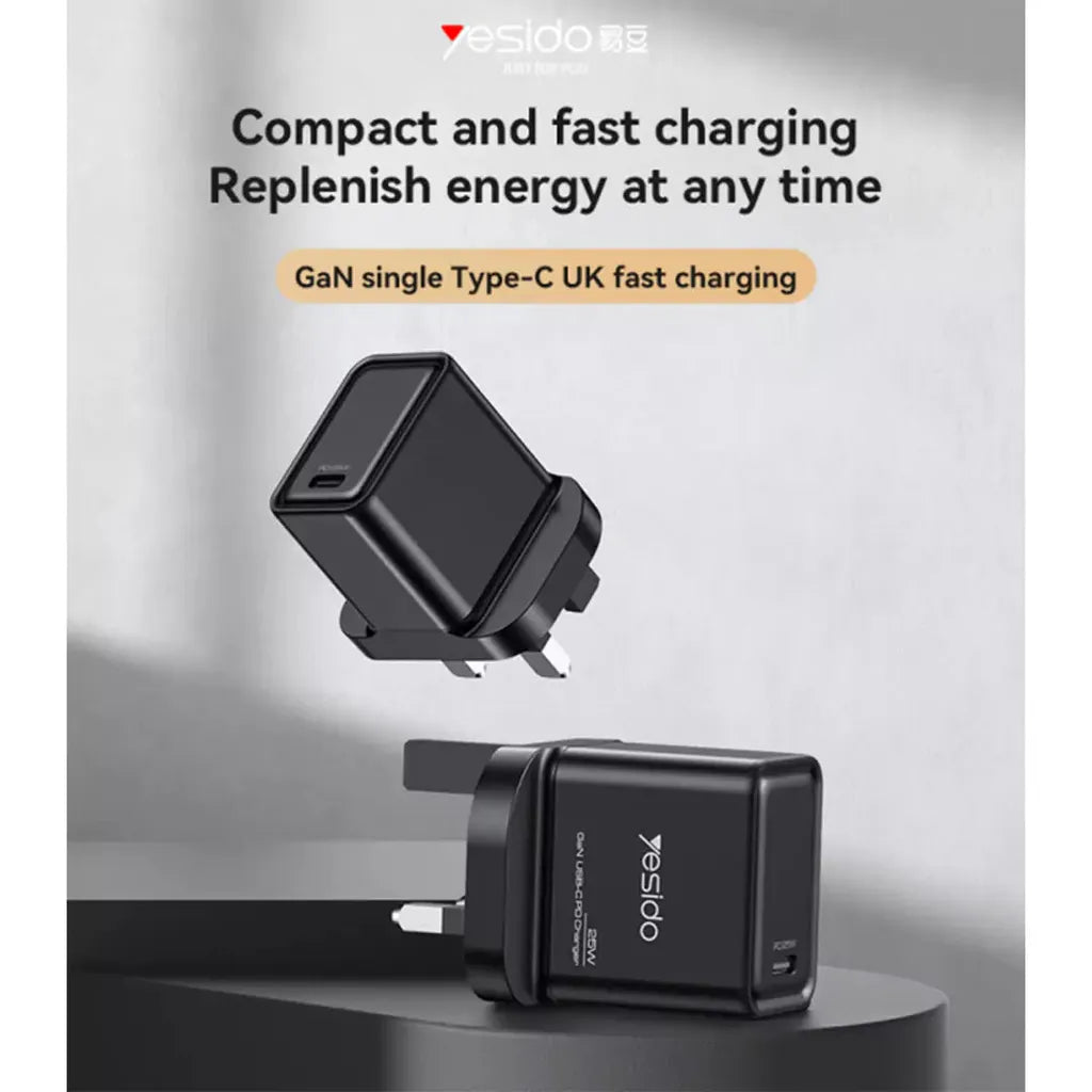 Power your devices quickly and safely with the Yesido YC81 25W GaN Fast Charger, a compact yet powerful wall adapter designed for modern smartphones and tablets. Utilizing advanced GaN (Gallium Nitride) technology, this charger delivers efficient 25W fast charging while remaining cool and energy-efficient. The fireproof PC construction ensures maximum safety during use, making it a reliable choice for daily charging needs.